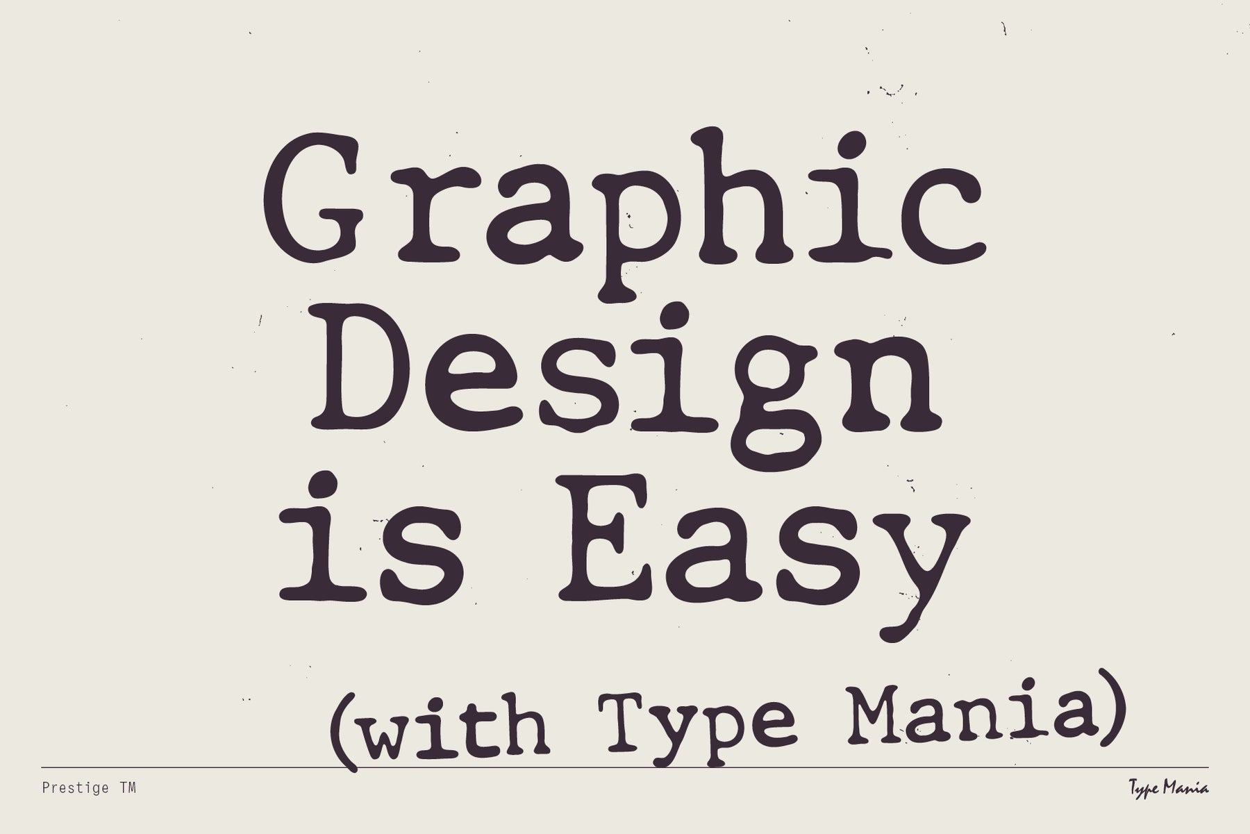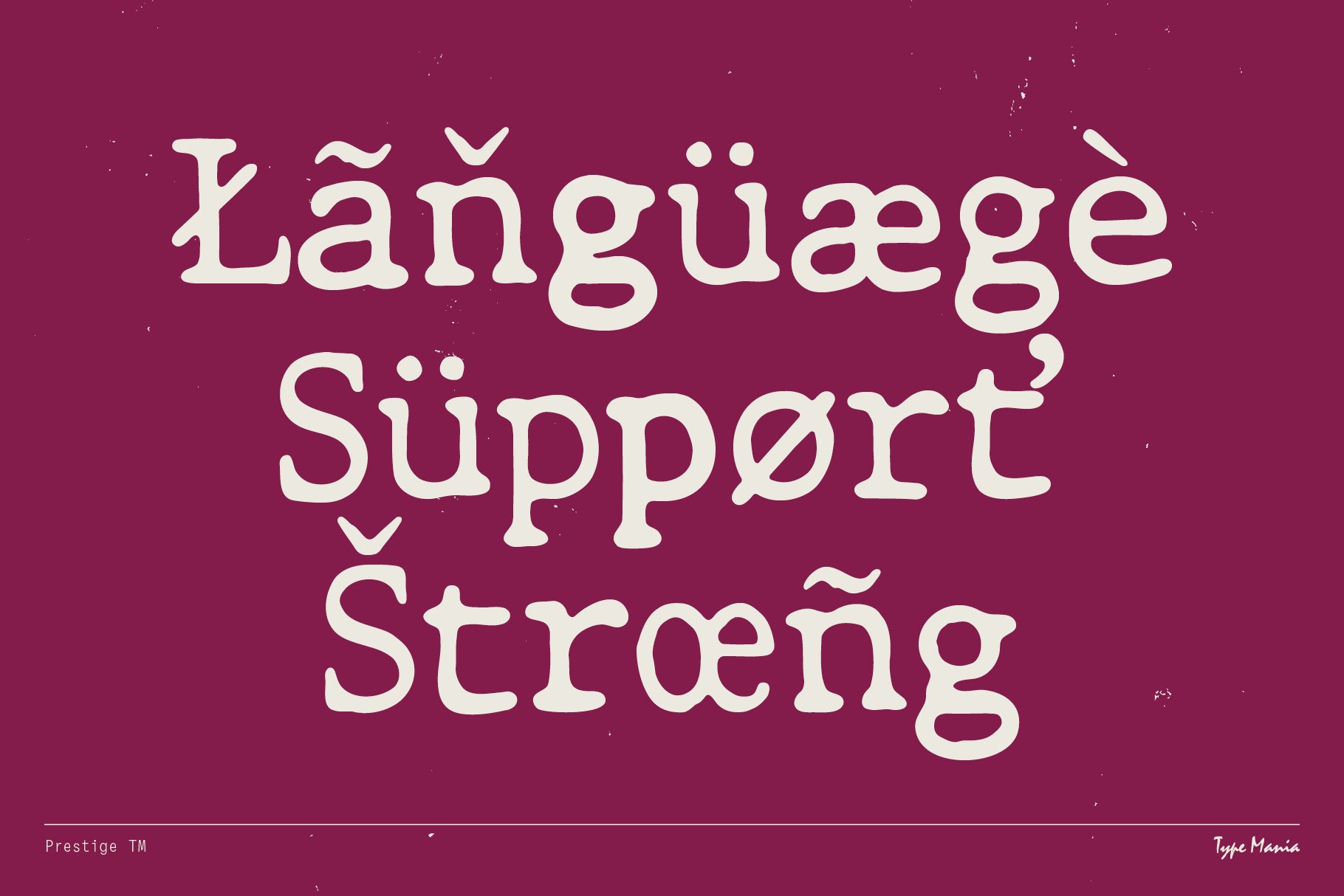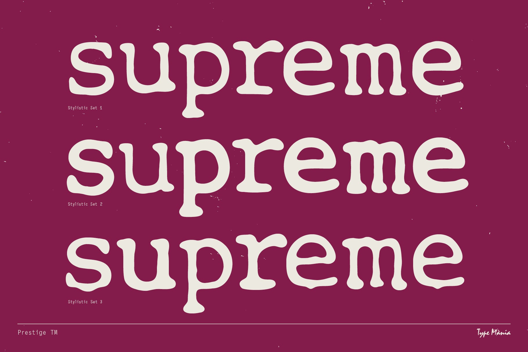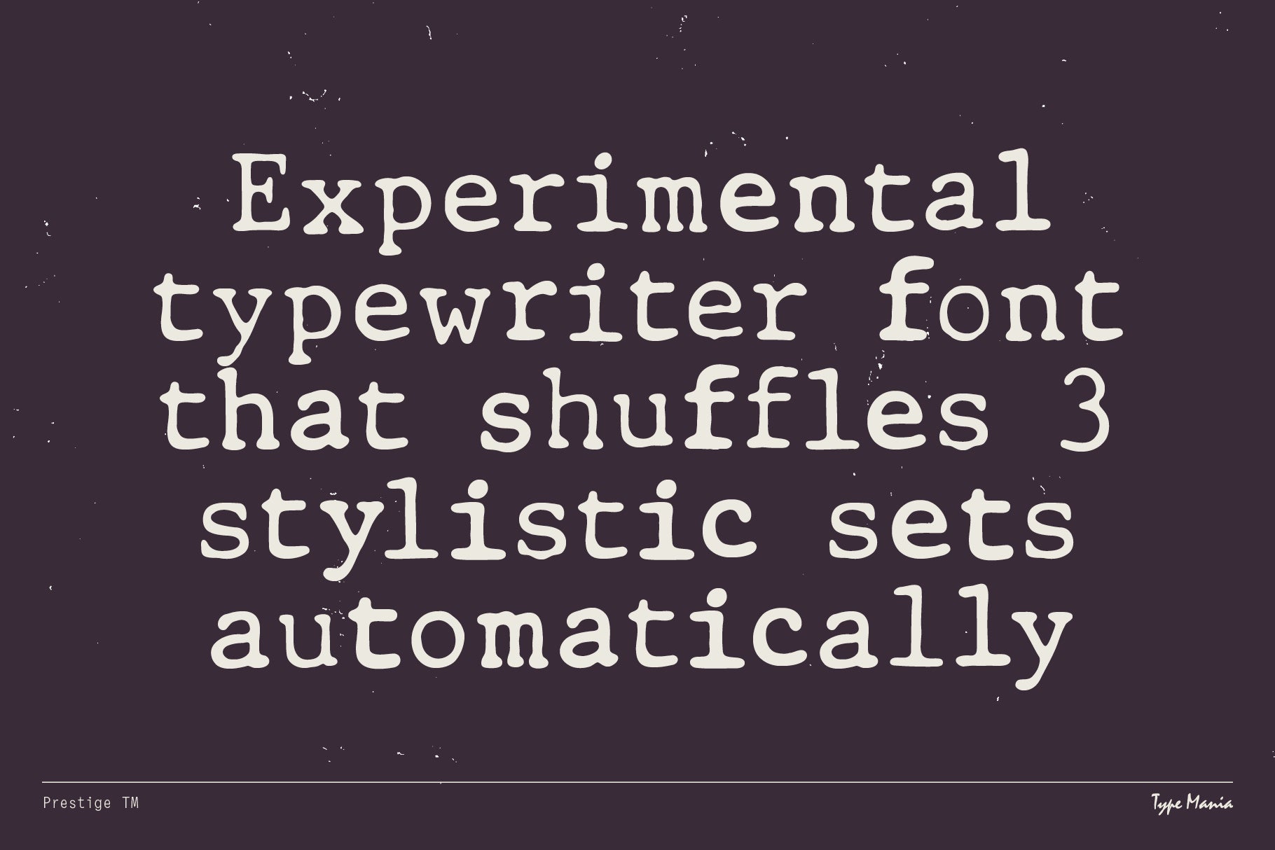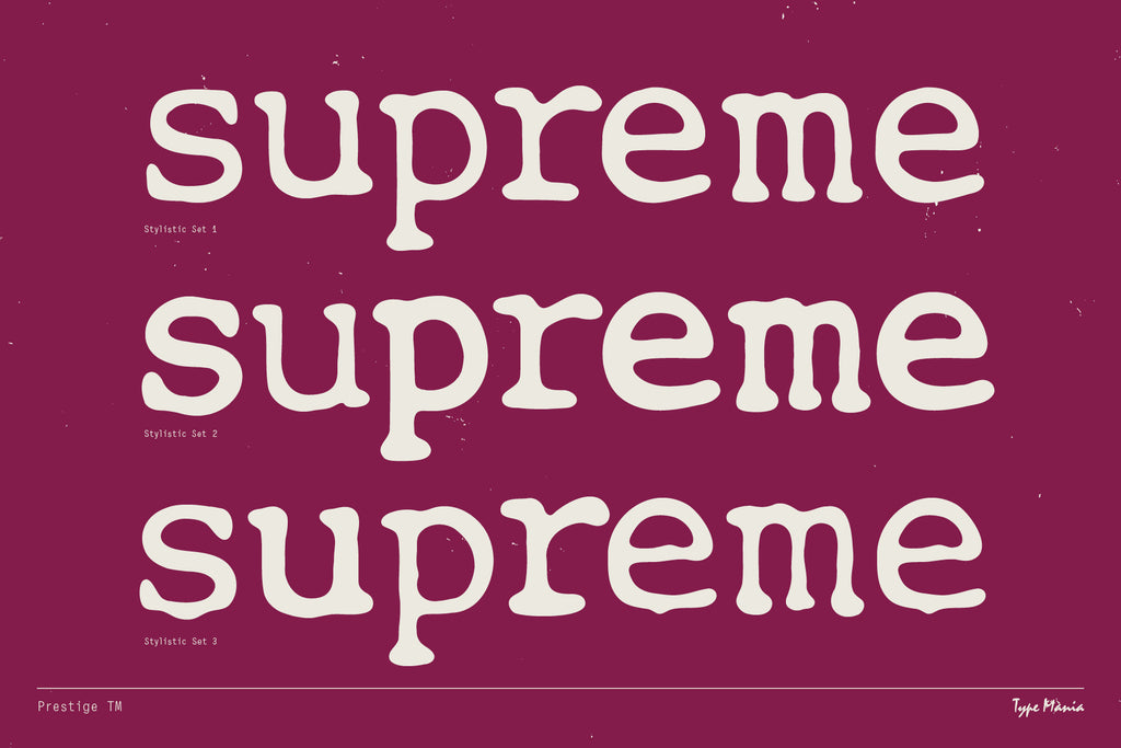 Prestige TM created by Type Mania is a serif typeface rooted in mid-century typeball machines. It has distressed throwback shapes, but introduces a dynamic edge: its three stylistic sets rotate automatically, creating the same irregular vibe as ink striking paper.
