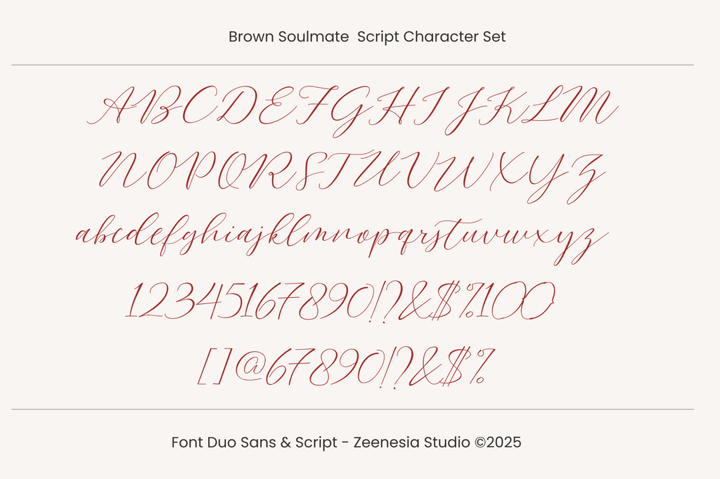 With its harmonious combination, Brown Soulmate is more than just a typeface—it's your perfect design partner for creating heartfelt, stylish, and standout projects.