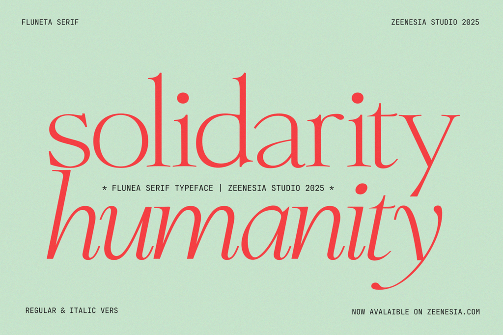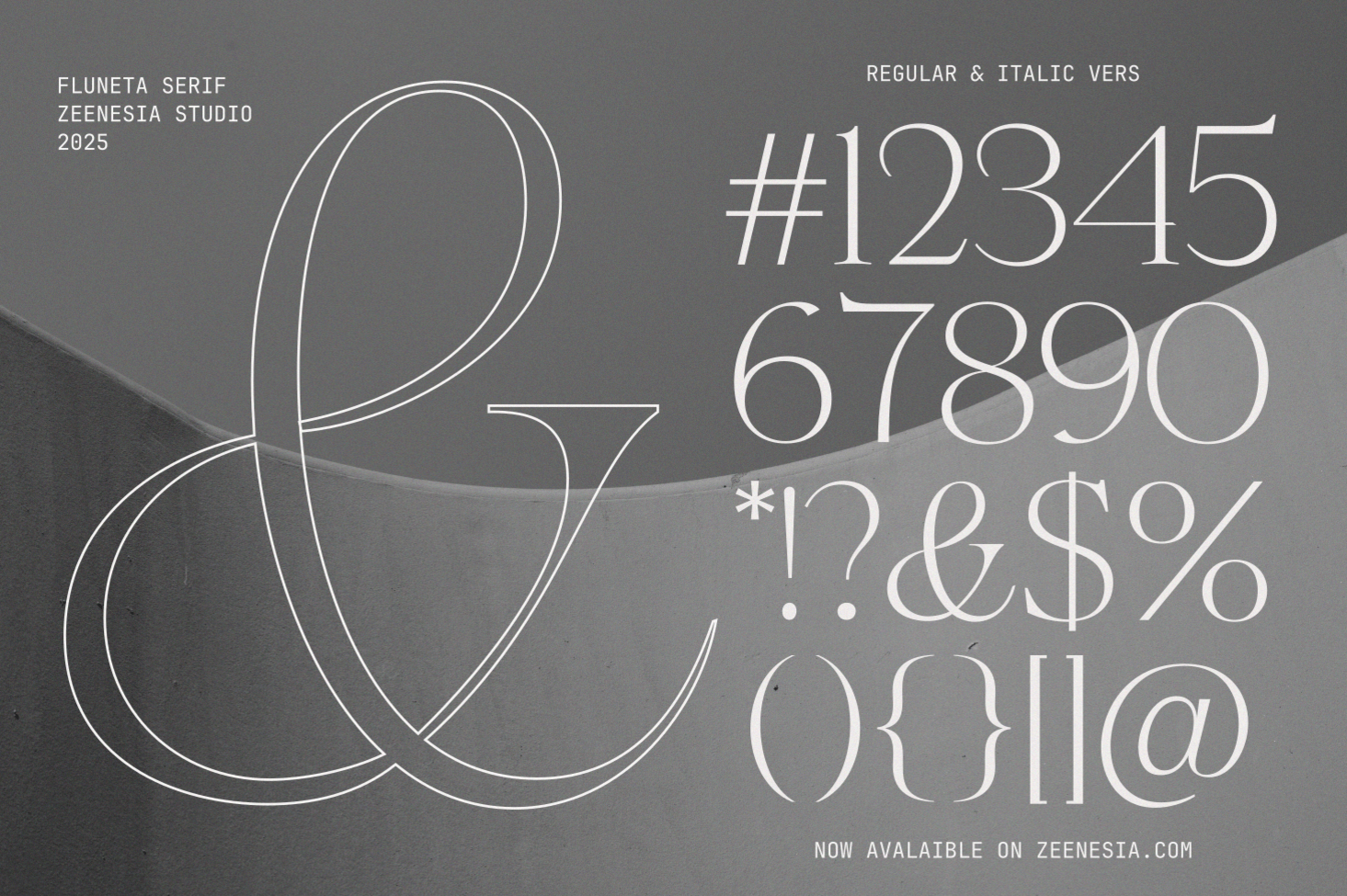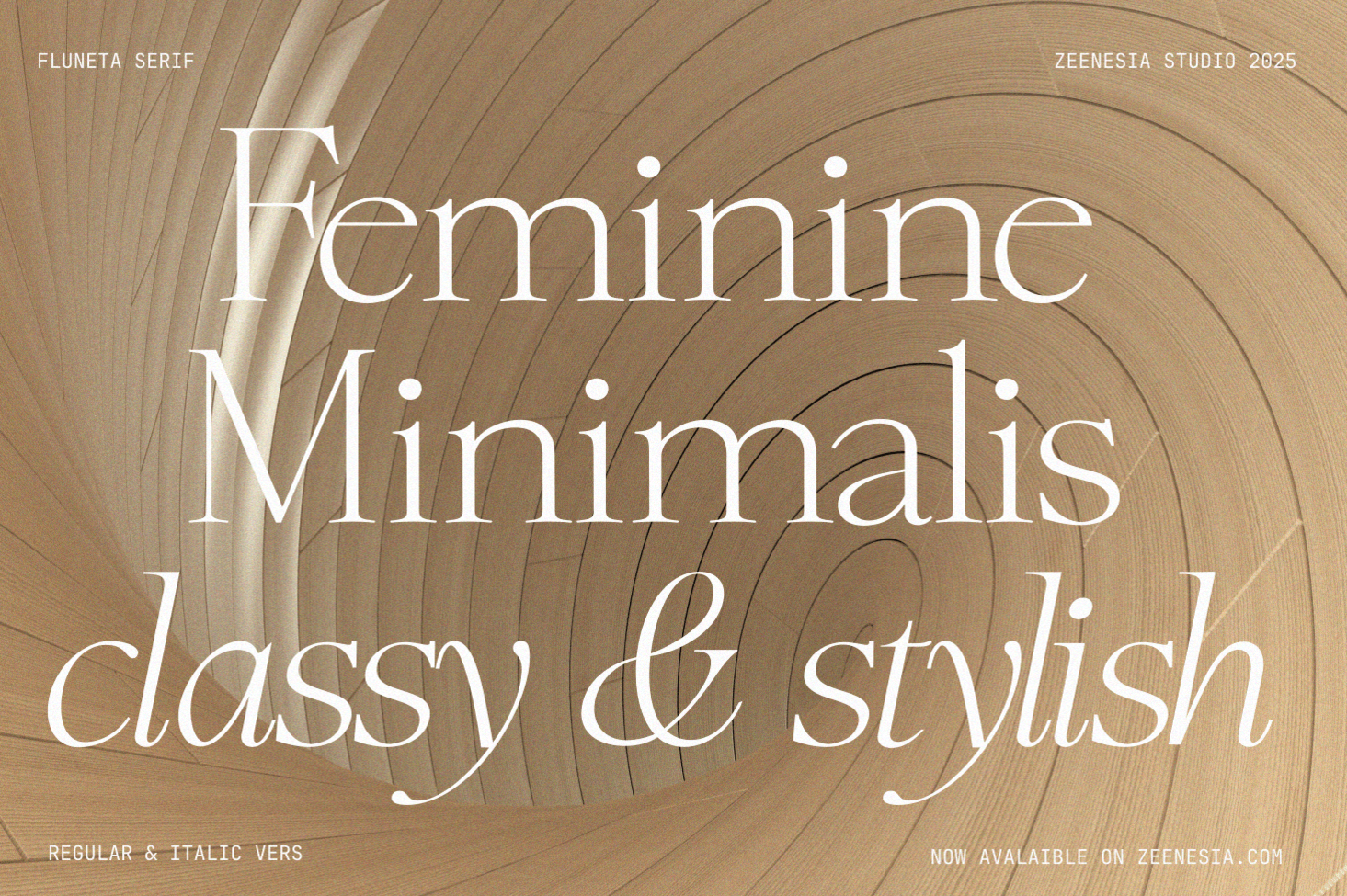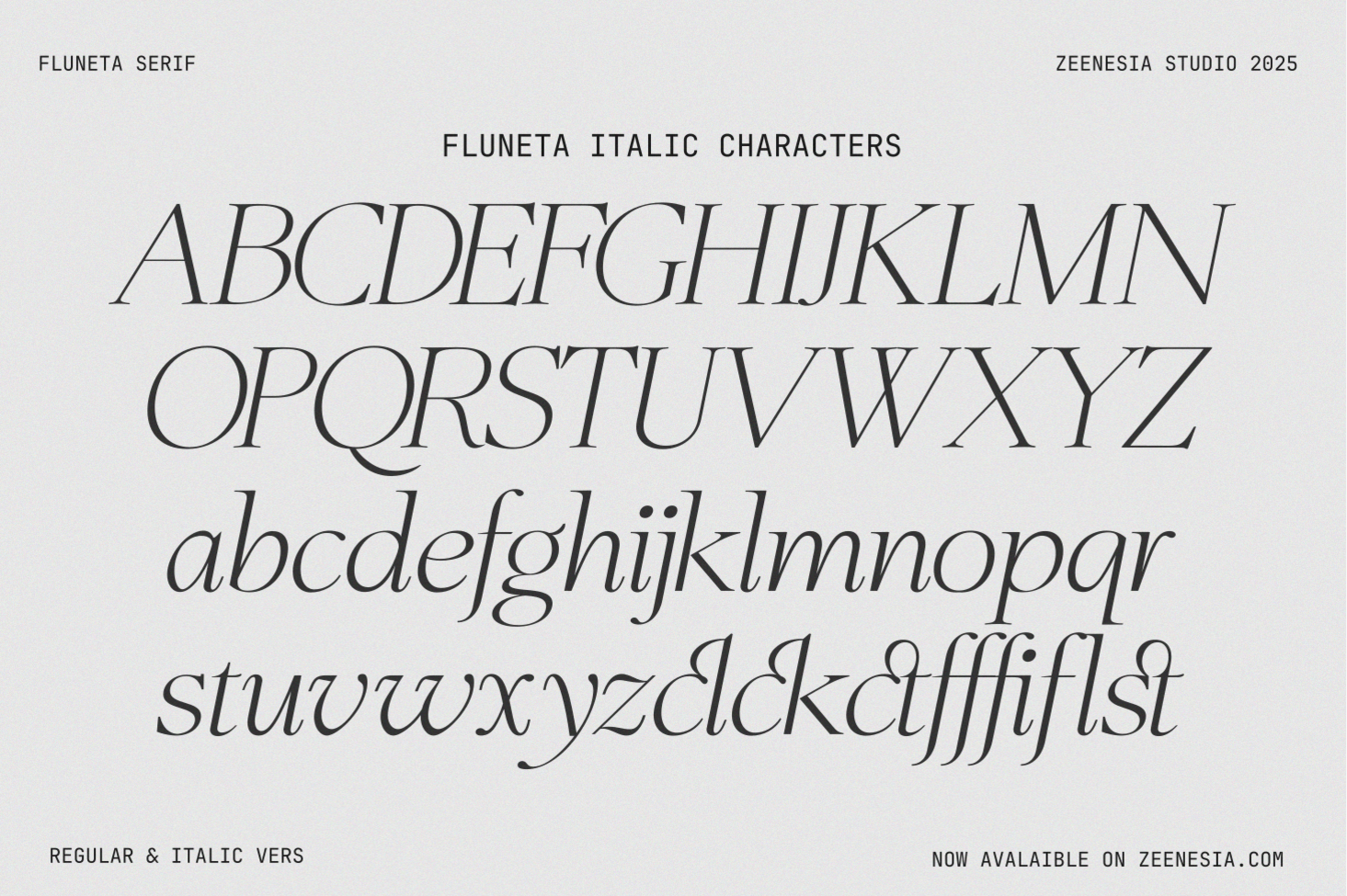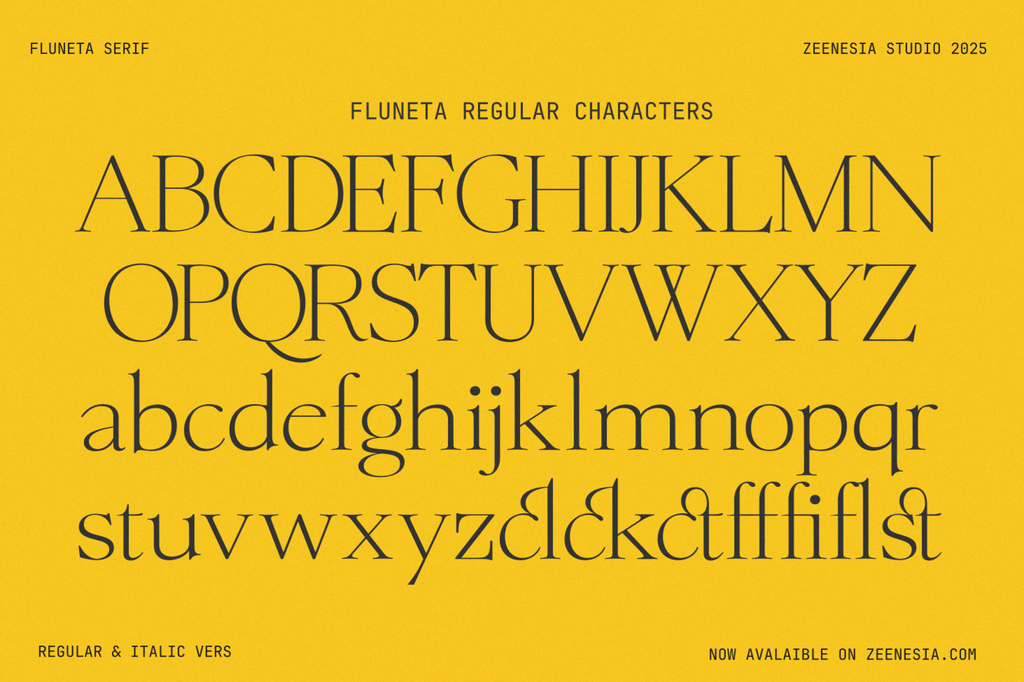 Fluneta created by zeenesia is a refined serif typeface that blends classic elegance with a touch of modern charm. Available in Regular and Italic styles, Fluneta was designed to bring sophistication and clarity to any layout — whether in print or digital.