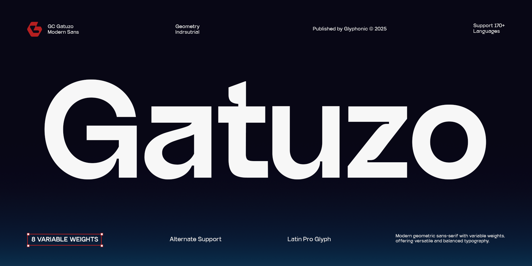 GC Gatuzo by Glyphonic – Geometric Sans is a contemporary sans serif typeface built on strong geometric foundations, designed to deliver clarity, balance, and modern versatility. With clean shapes and confident strokes, it offers a bold yet refined voice that performs seamlessly across both digital and print applications.