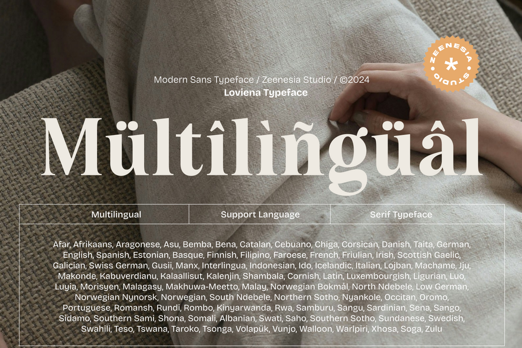 Designed for versatility, Loviena offers exceptional readability and supports multilingual characters, making it an ideal choice for creating designs with a timeless, humanistic touch.