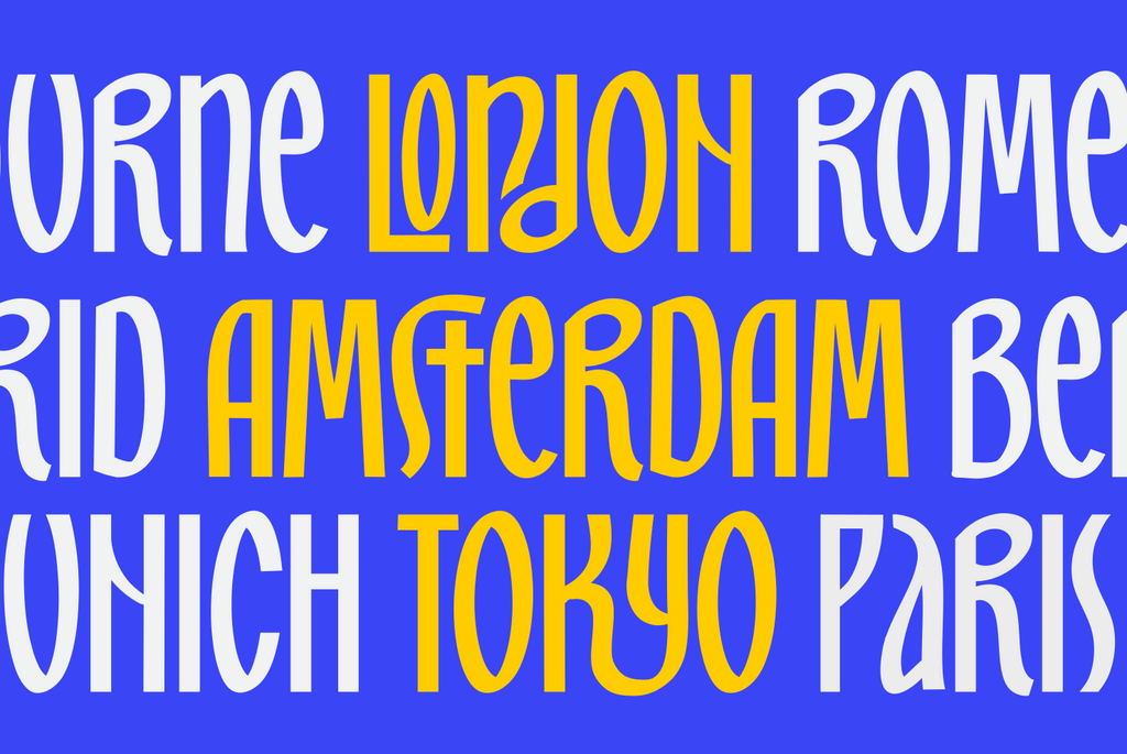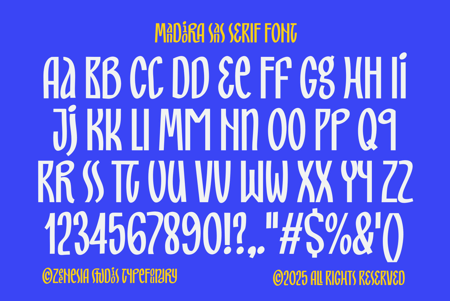 Perfect for branding, posters, editorial titles, and creative projects, Mandiora brings a touch of personality and playfulness to your typography. Its tall shapes, dynamic rhythm, and distinctive details make it a true statement piece for designers who love to explore new visual territories. Mandiora — where modern design meets experimental expression.