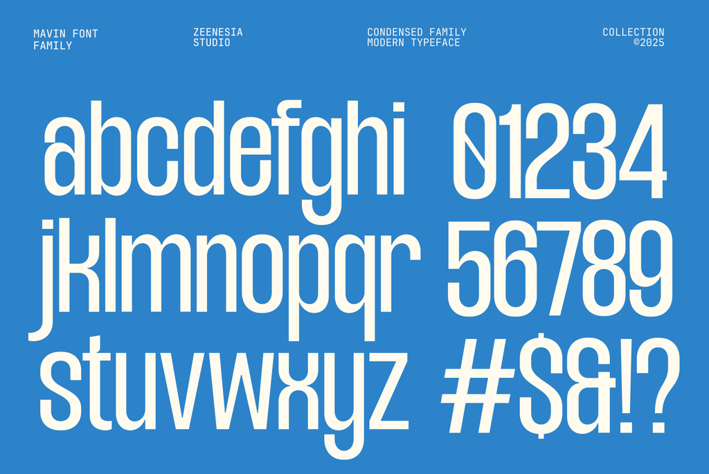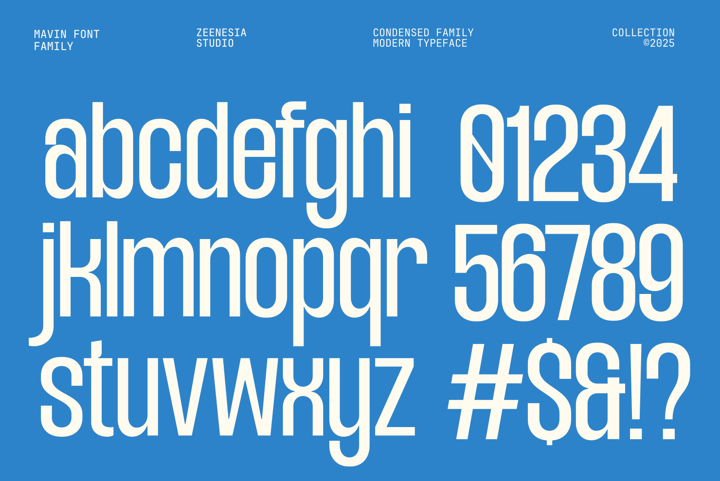 Mavine by zeenesia is a bold and modern condensed typeface family designed for powerful visual impact. With its tall proportions, sharp geometry, and confident personality, Mavine delivers maximum presence in minimal horizontal space.