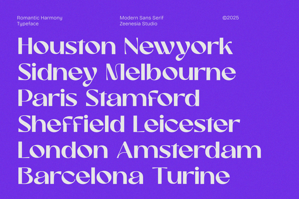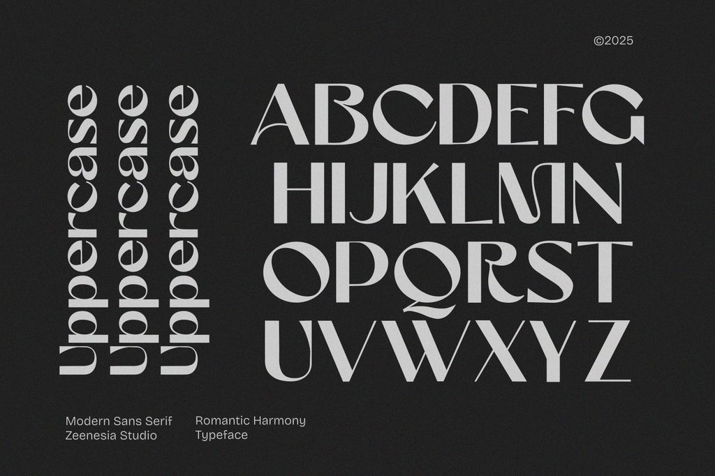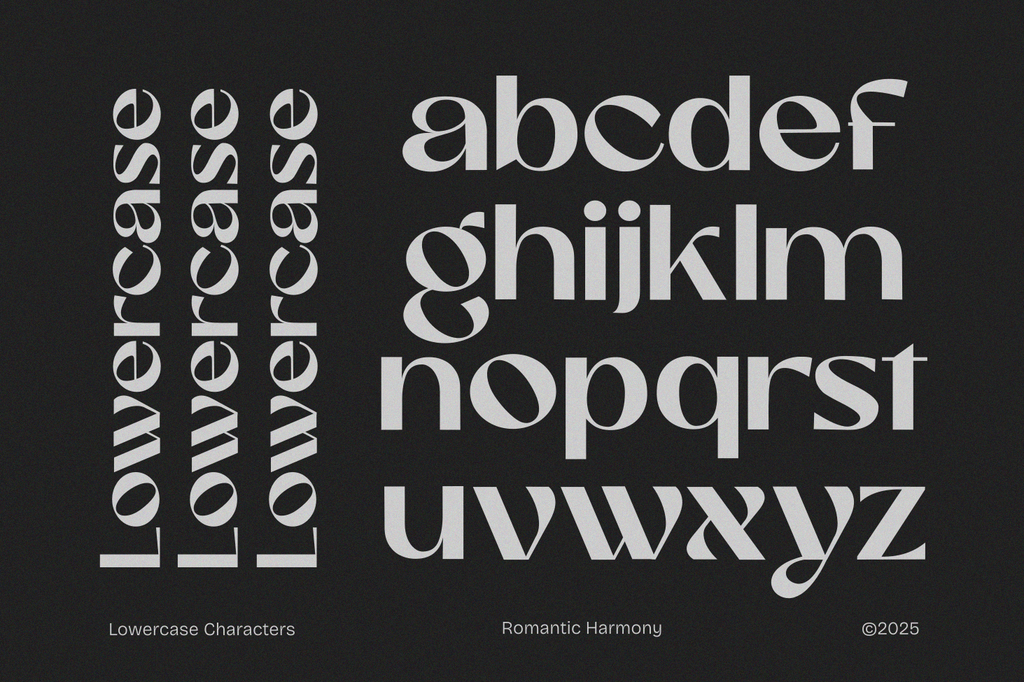 Romantic Harmony is a striking sans-serif font designed to make a lasting impression. With its strong character and distinctive personality, this font blends modern aesthetics with timeless appeal.