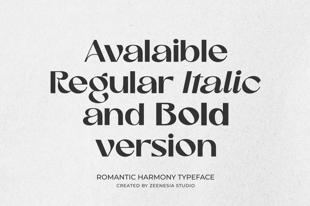 Featuring three versatile styles—Regular, Italic, and Bold—Romantic Harmony adapts effortlessly to various design needs, from branding and editorial layouts to packaging and digital interfaces. Whether you're aiming for sophistication or contemporary minimalism, this font delivers both power and grace in every letterform.
