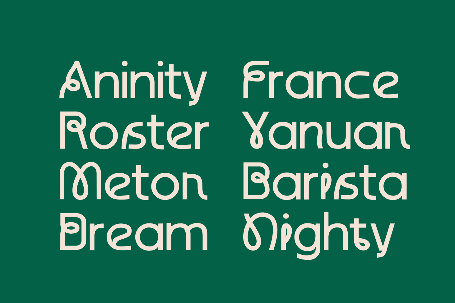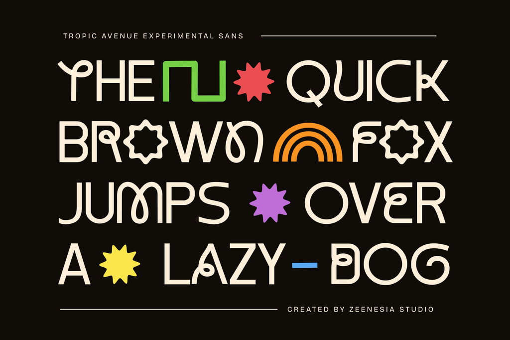 Tropic Avenue created by zeenesia is an experimental sans serif font. Its distinctive structure blends bold strokes with organic curves, offering a fresh take on modern typography. Each letter is thoughtfully designed to achieve a balance between clarity and artistic expression. Ideal for contemporary branding, editorial layouts, and digital media, Tropic Avenue draws attention with its unconventional yet highly legible form.