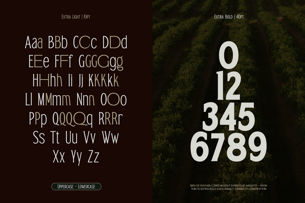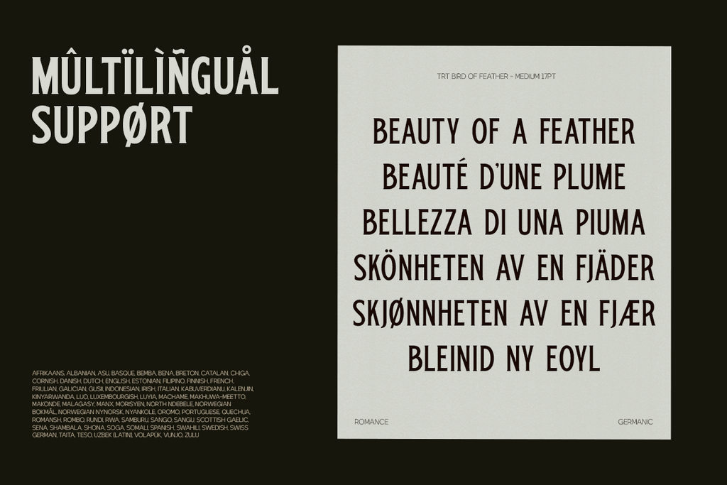Its graceful curves and moderate contrast make it a versatile choice for editorial layouts, branding, book covers, logos, and luxury packaging. Whether used in headlines or long-form text, TRT Bird of Feather brings a unique voice — dignified, yet expressive.
