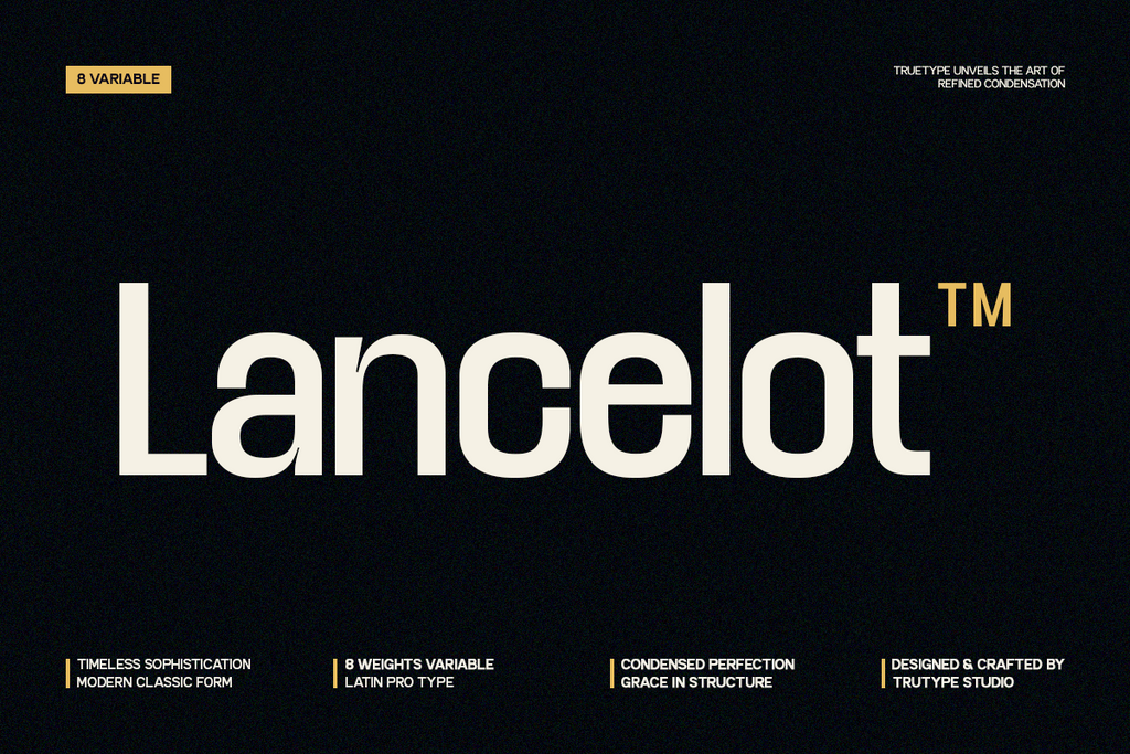 TRT Lancelot by TrueType is a modern condensed typeface featuring distinctive inktrap details and a full range of weights from Thin to Extra Bold. Its compact structure and sharp inktraps create a strong visual identity, making it perfect for impactful headlines, branding, posters, and editorial layouts.