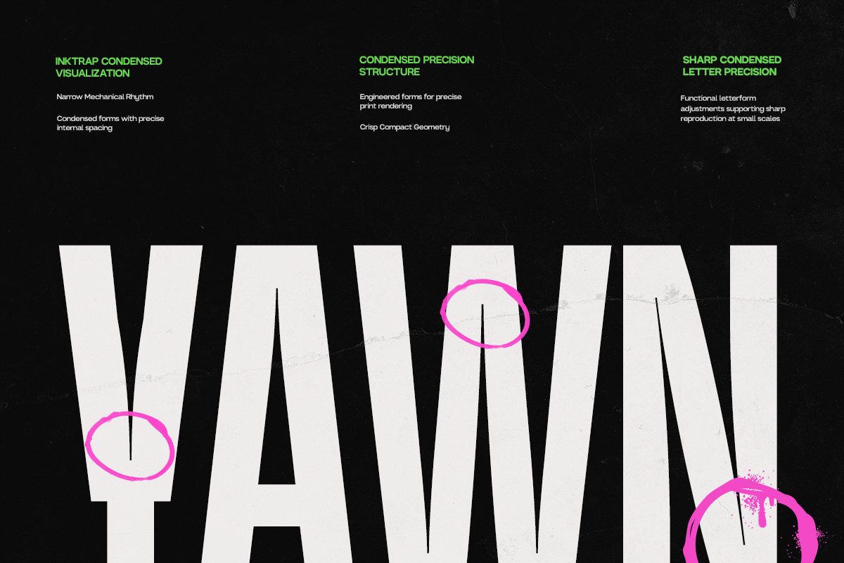 Its condensed proportions create a strong vertical rhythm, making Midgod ideal for headlines, posters, and editorial systems where space, hierarchy, and impact matter. The ink traps are not merely decorative; they enhance clarity, texture, and durability across print and digital environments, giving the typeface a distinctly contemporary edge.