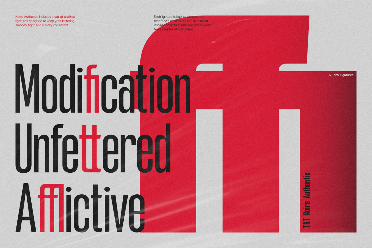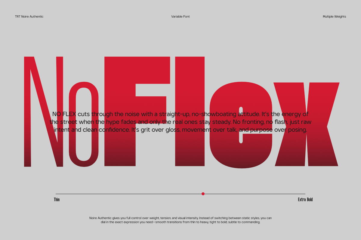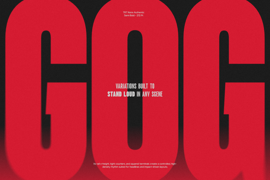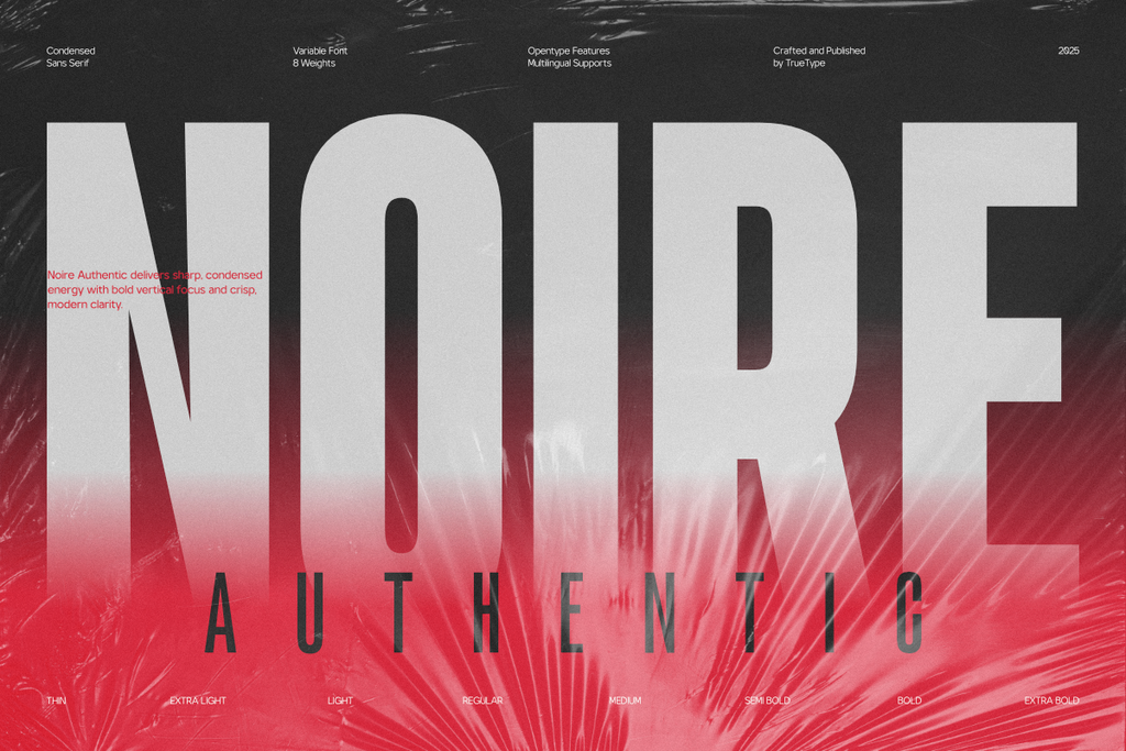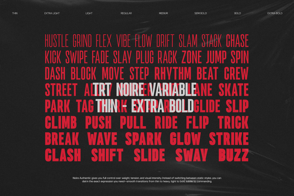 As a variable font with eight weights from Thin to Extra Bold, TRT NOIRE AUTHENTIC lets you move effortlessly from ghost‑like, transparent titles to dense, heavy statements in one continuous spectrum. OpenType features and multilingual support keep it versatile for global use, from album covers and tour posters to contemporary noir‑style opening sequences.