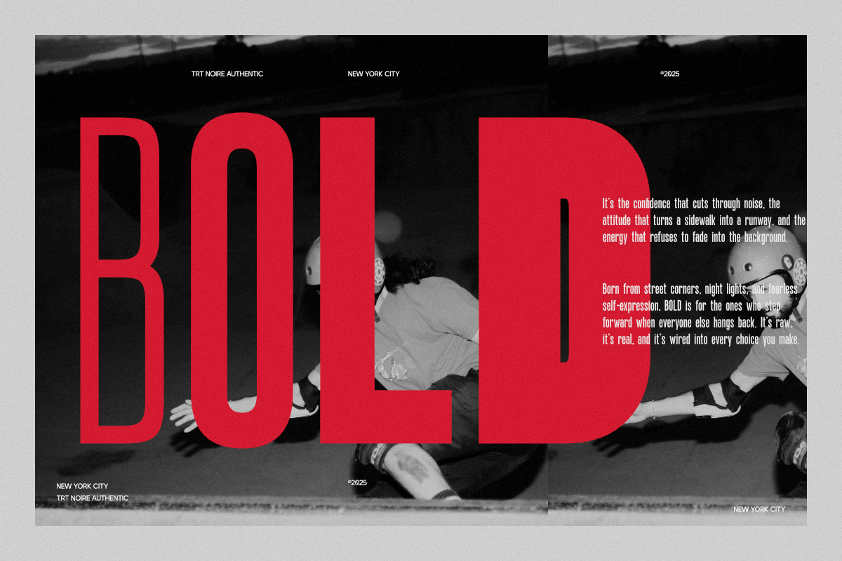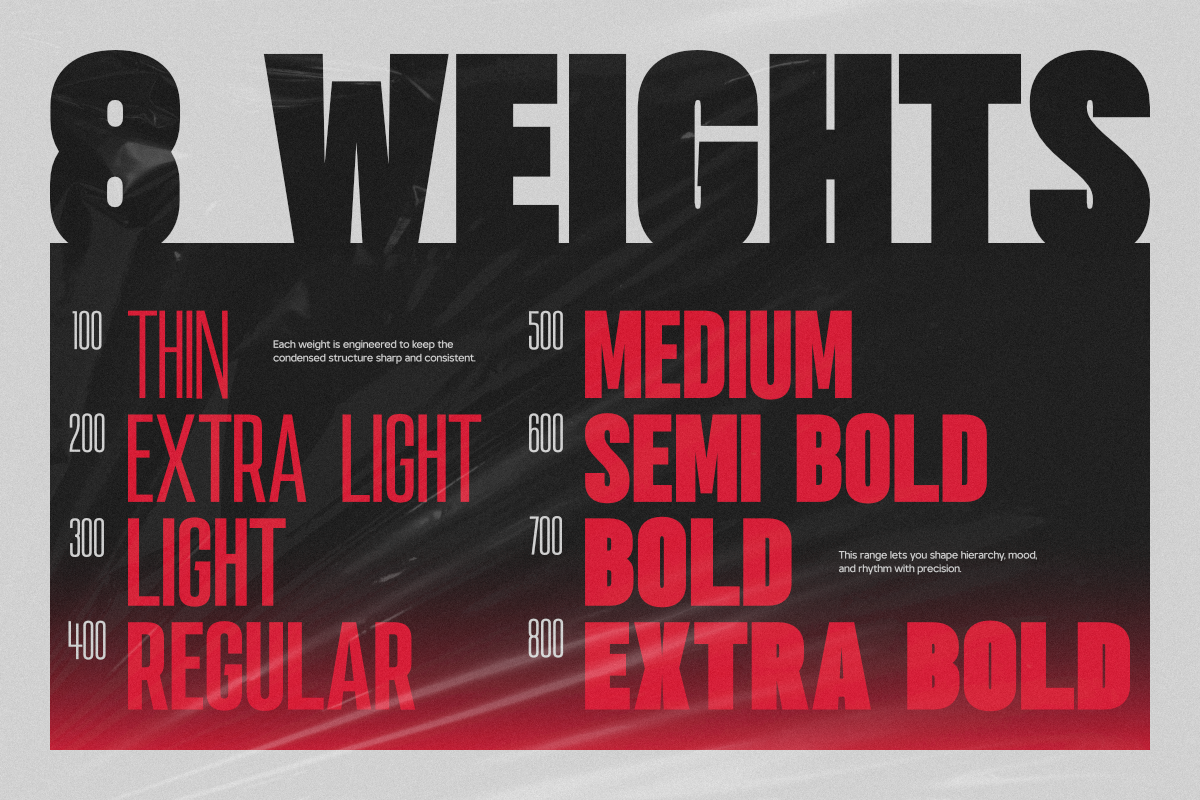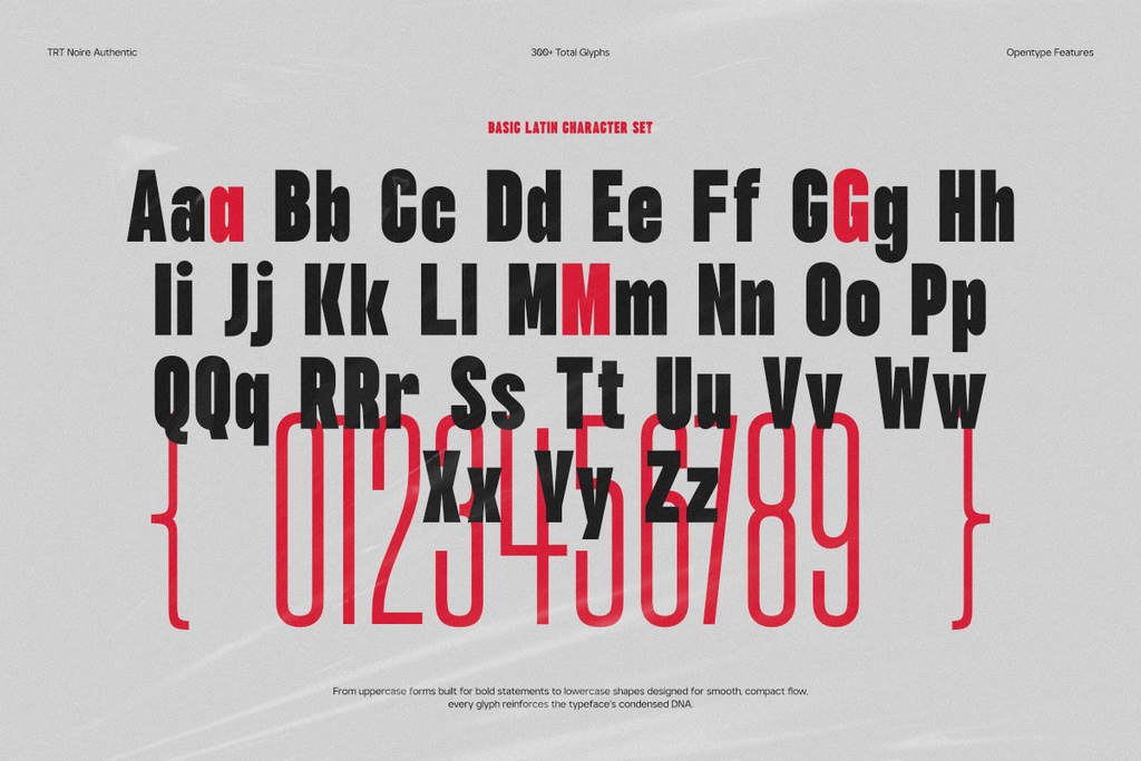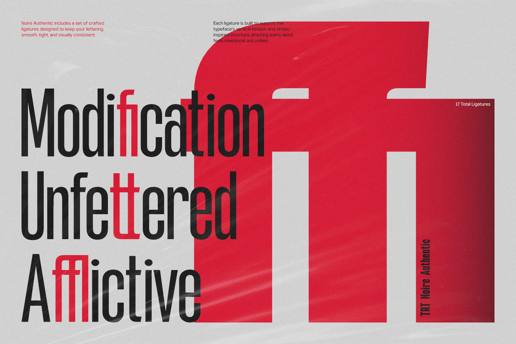 As a variable font with eight weights from Thin to Extra Bold, TRT NOIRE AUTHENTIC lets you move effortlessly from ghost‑like, transparent titles to dense, heavy statements in one continuous spectrum. OpenType features and multilingual support keep it versatile for global use, from album covers and tour posters to contemporary noir‑style opening sequences.