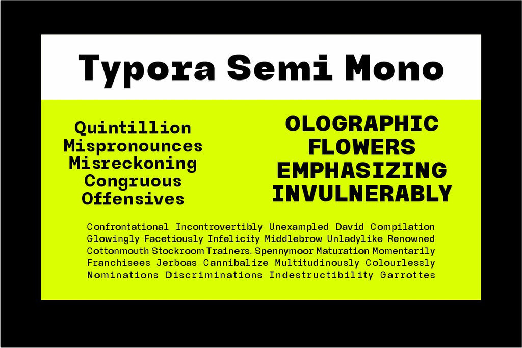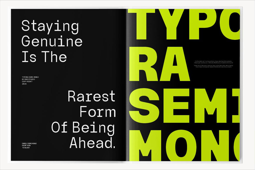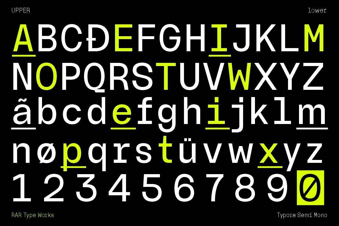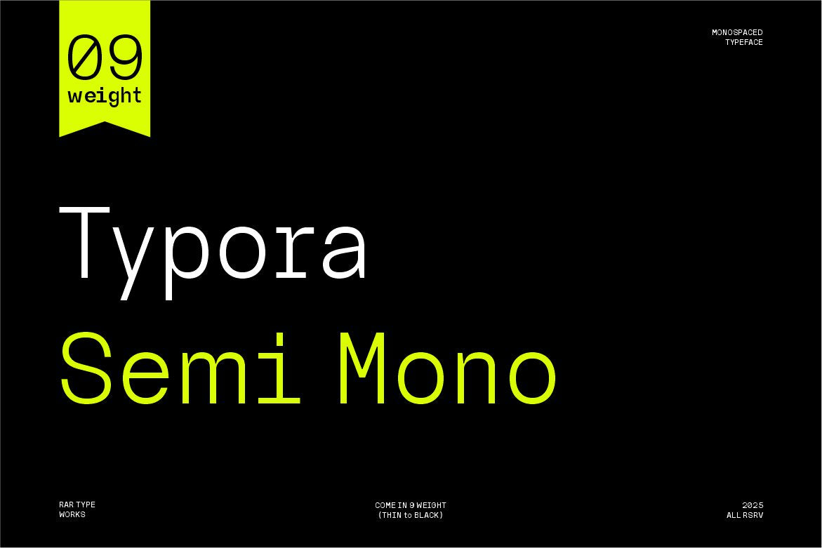 Typora Semi Mono crdeated by Rar Typeworks is a refined semi–monospaced typeface family designed for creators who want the precision of monospace with the elegance of proportional typography.