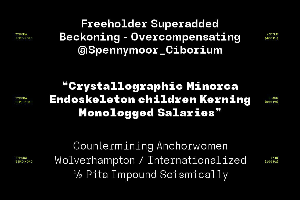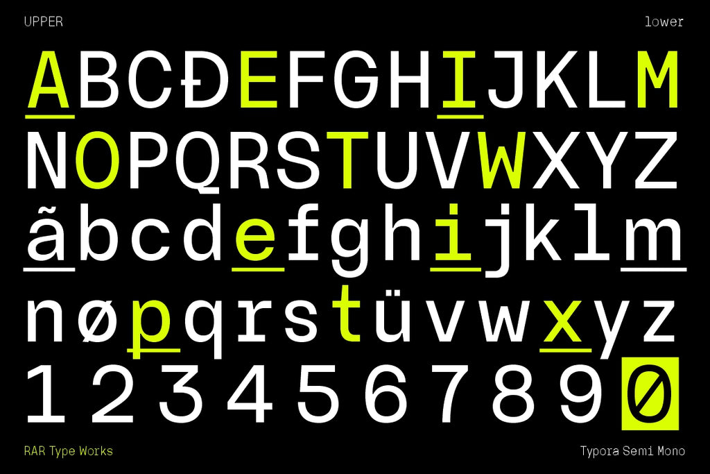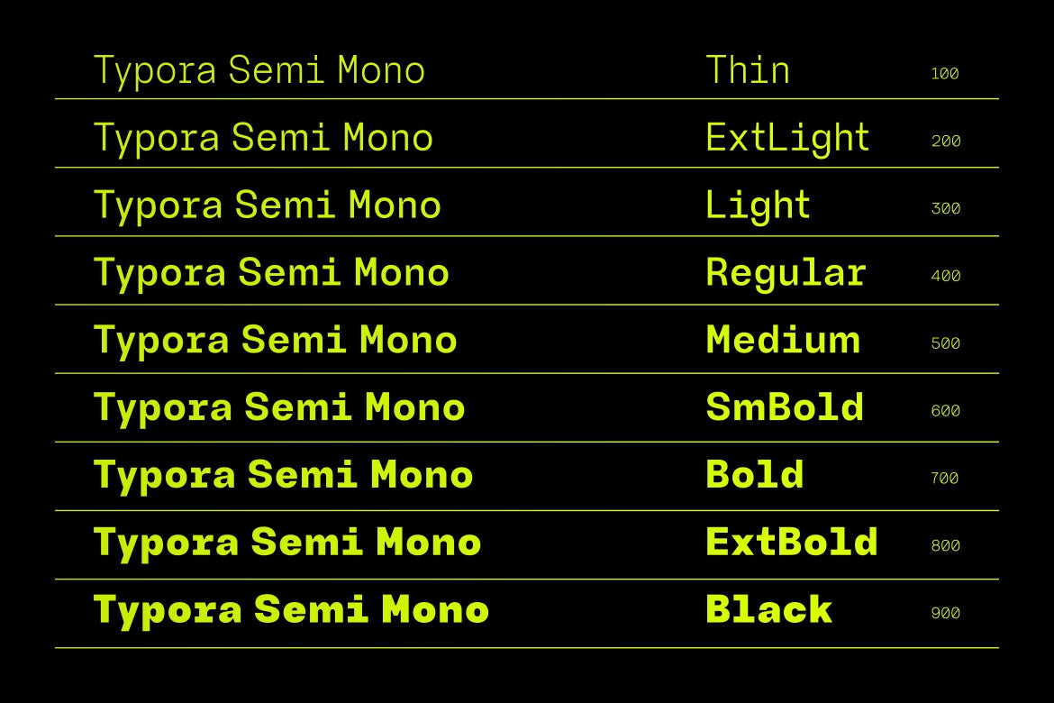 With its clean geometry, balanced spacing, and subtle humanist touches, Typora Semi Mono excels in UI/UX design, coding themes, editorial layouts, branding, and digital interfaces. The semi-monospaced structure provides a technical aesthetic without sacrificing readability, making it ideal for designers seeking a modern, minimal, and highly usable type system.