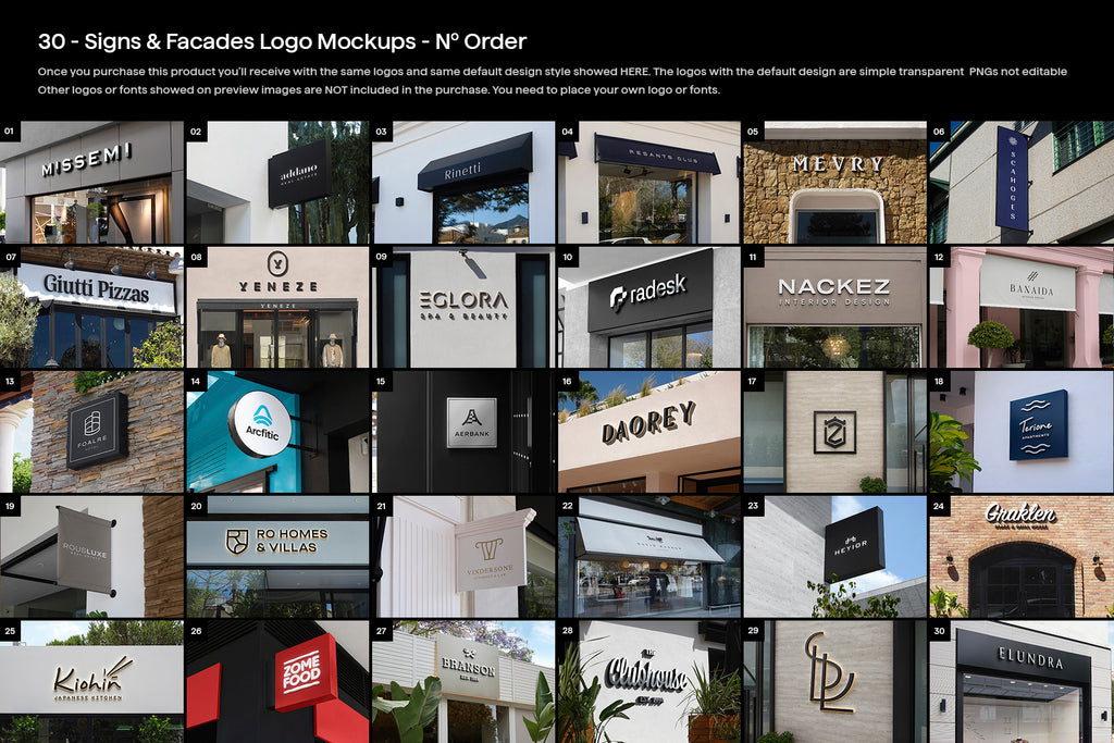 Introducing our new Volume 4 Bundle of store signs and facade logo mockups. This collection offers realistic mockup effects, with most designs featuring a range of logo styles and customizable color options. Easily place your logo and customize it with your own designs with just a few clicks using Smart Objects. Check out the details of each mockup in the description below for more information. Features: - Includes 30 PSD Files - Premade Scenes - Ready to customize it and place your logo with few clicks. (Showed on 2nd Picture). - High-Resolution Files at 3600 x 2400 - 300 DPI. - Every file is very well organized and easy to understand. - Includes multiple logo effects depending on the style of mockup from flat, 3D, 3D luminous, etc. - Customizable colors on 27 of 30 mockups. Please watch the preview images and the description below of which has customization options. - Includes a tutorial on how to replace the logo with your own + how to change perspective left & right side.