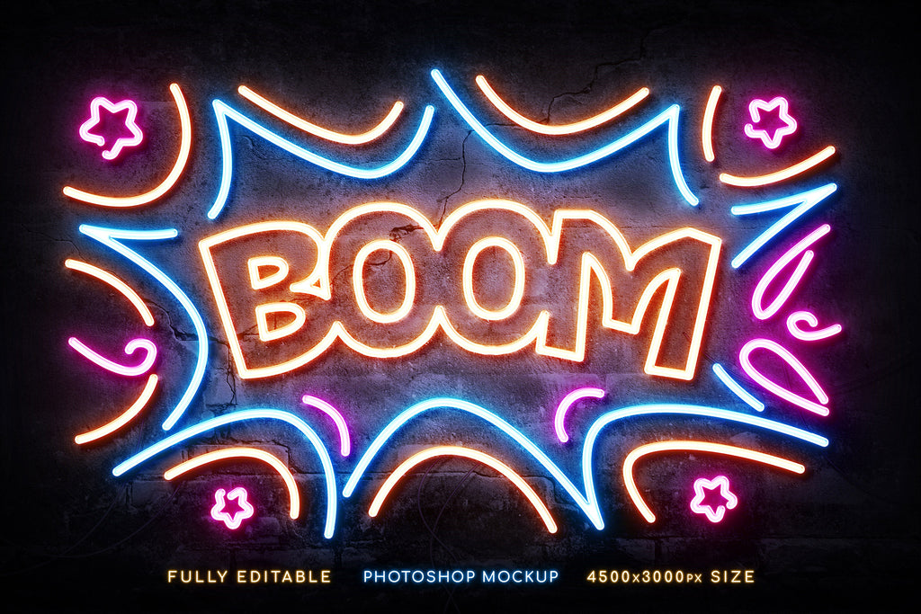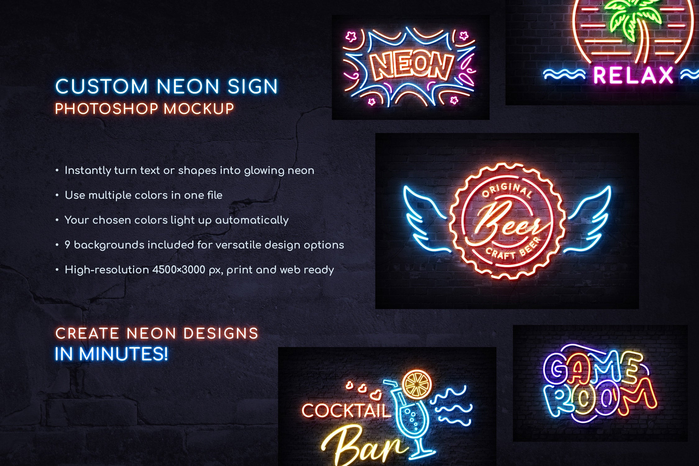 - 5 Photoshop Mockups - Realistic neon glow & reflections - Multiple colors supported in one design - Your chosen colors light up automatically - 9 backgrounds included - High-resolution 4500×3000 px