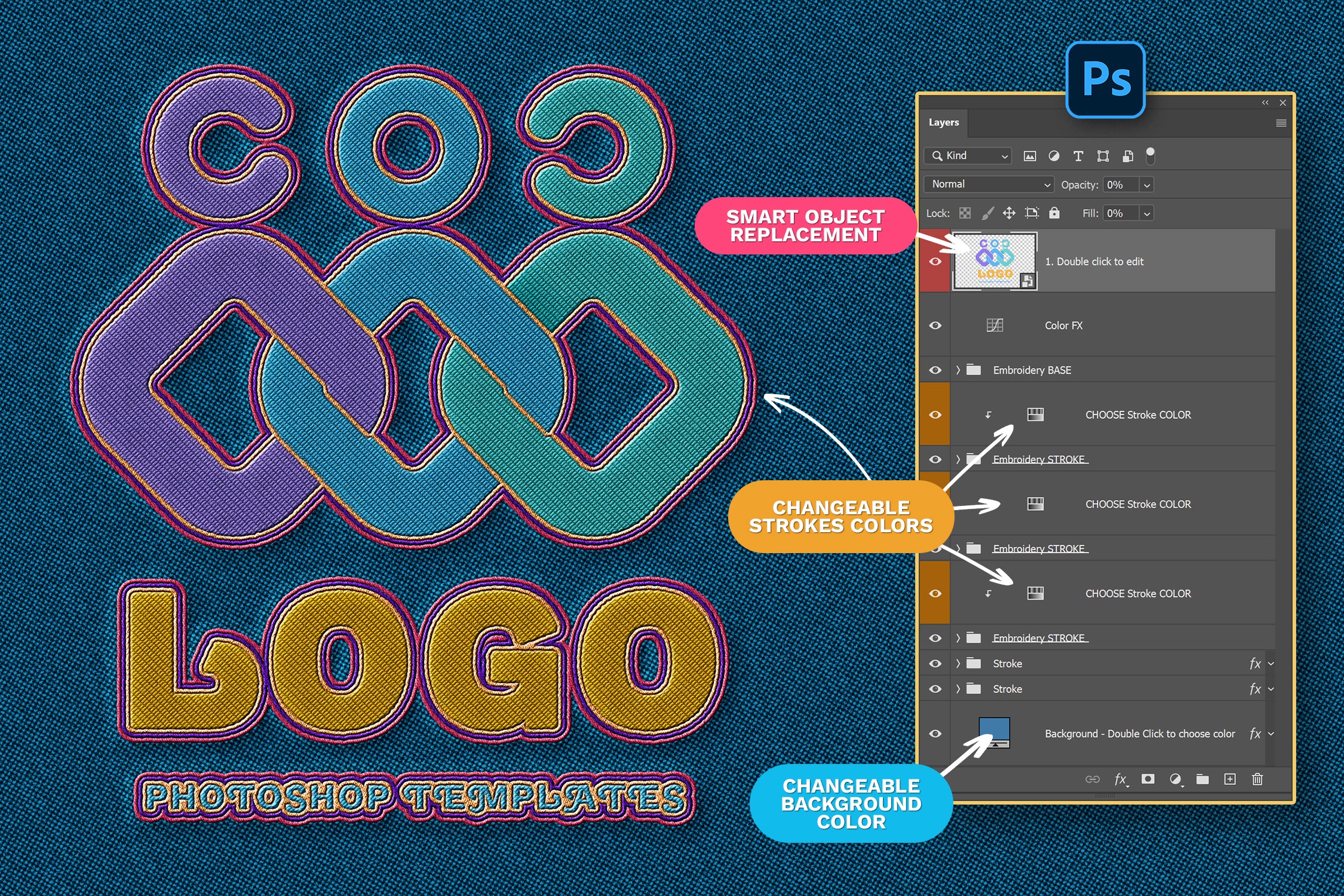 Using this easy-to-use PSD template is simple: just place your design into the smart object and you'll instantly get a realistic embroidery patch effect. This makes it a perfect choice for showcasing your designs in a professional and stylish manner.
