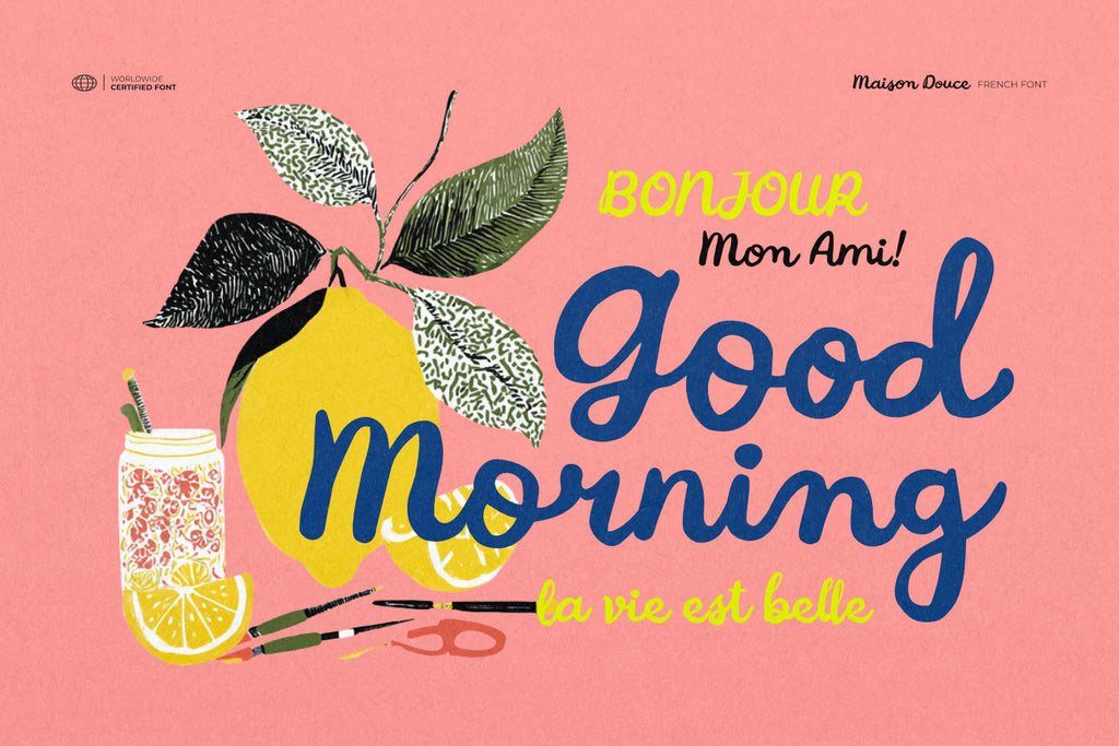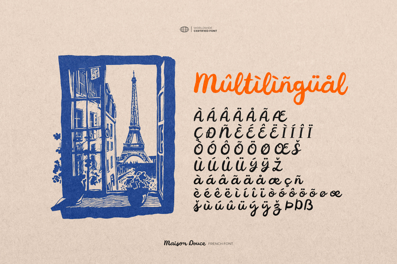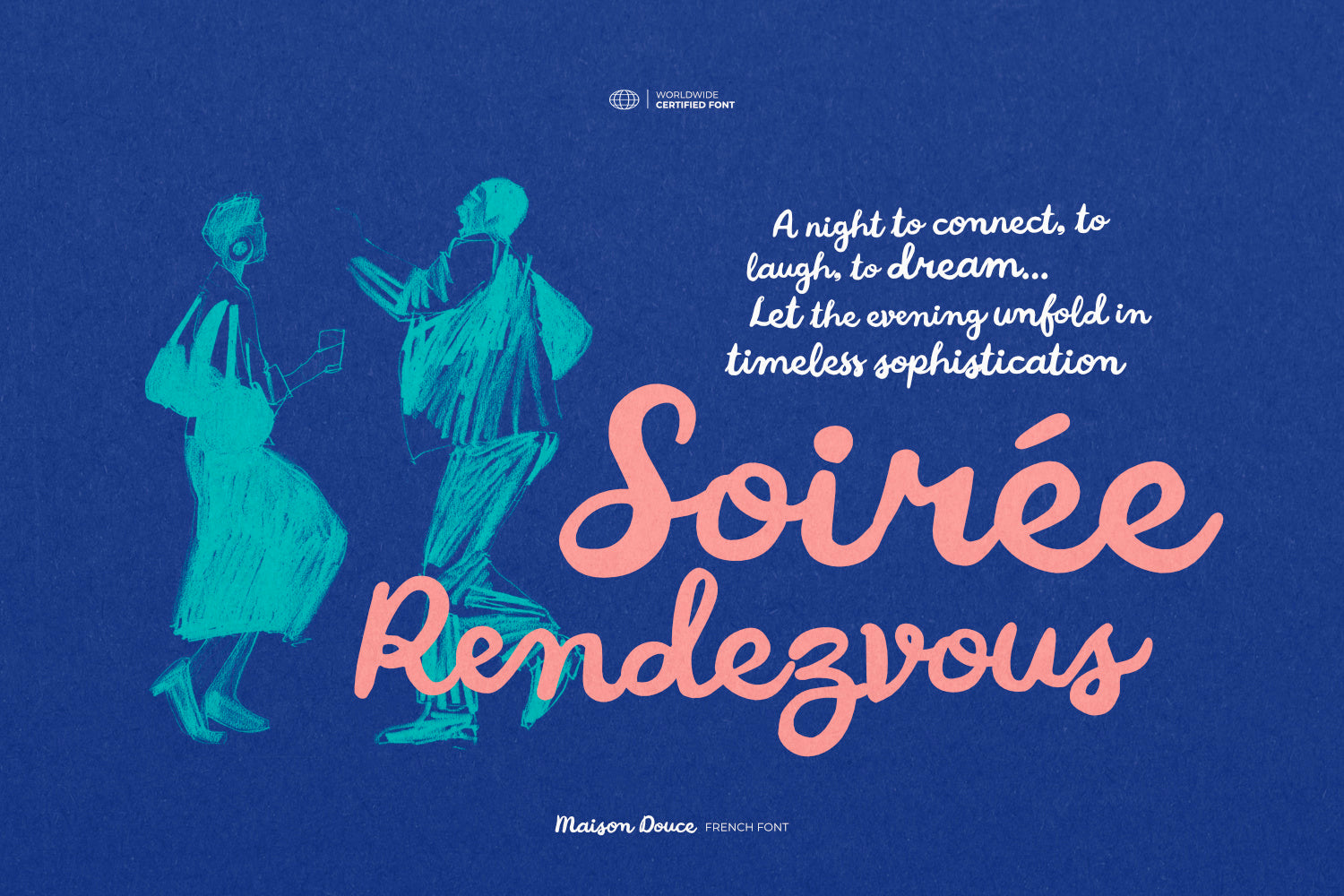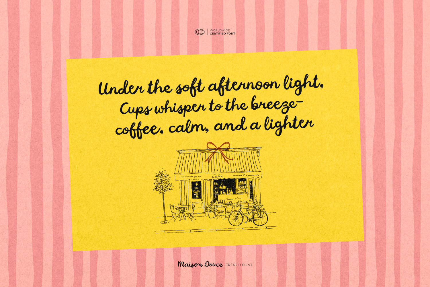 Crafted with a human touch, Maison Douce captures authentic handmade strokes—bold, smooth, and full of personality—making it perfect for branding and anything that needs that unmistakable French vibes look. Whether you're designing for a dreamy Parisian café brand or adding artistic flair to your digital creations, Maison Douce brings the spirit of Paris, the warmth of traditional art, and the fluid romance of real handwriting in one beautiful, expressive font.
