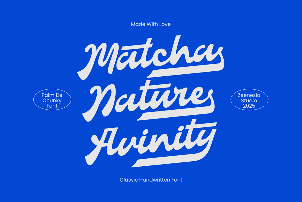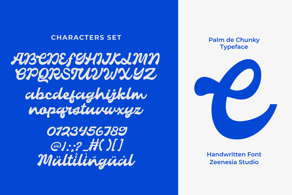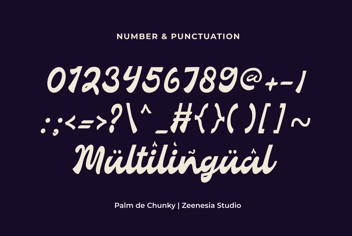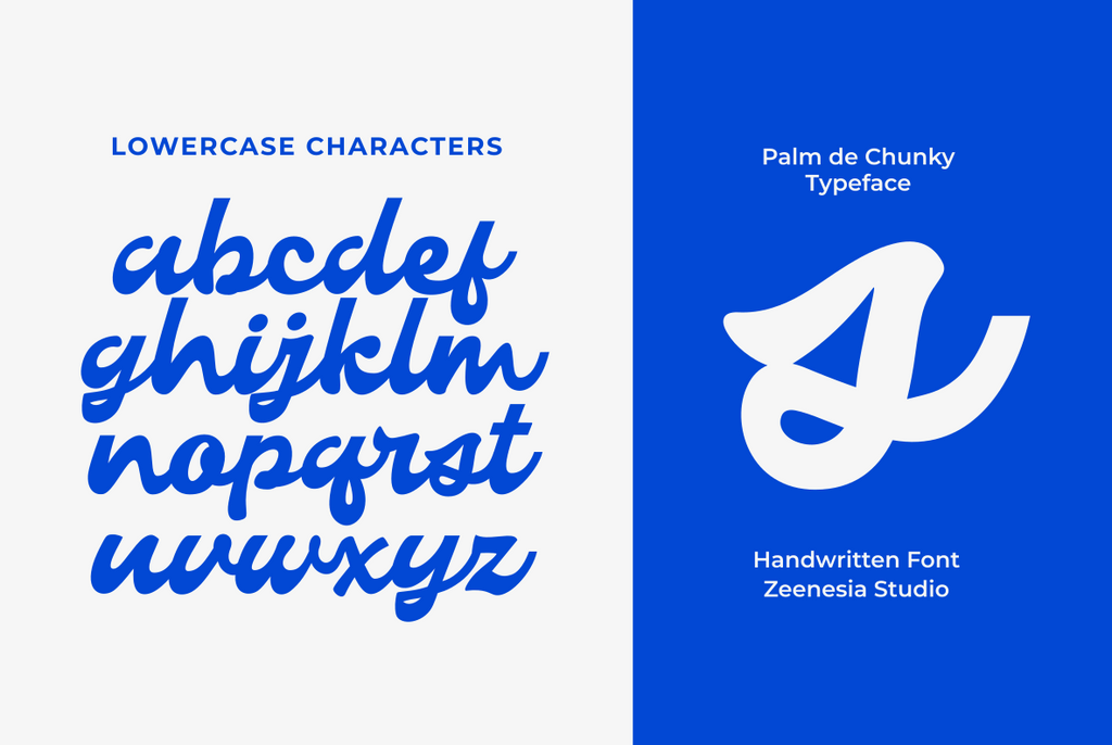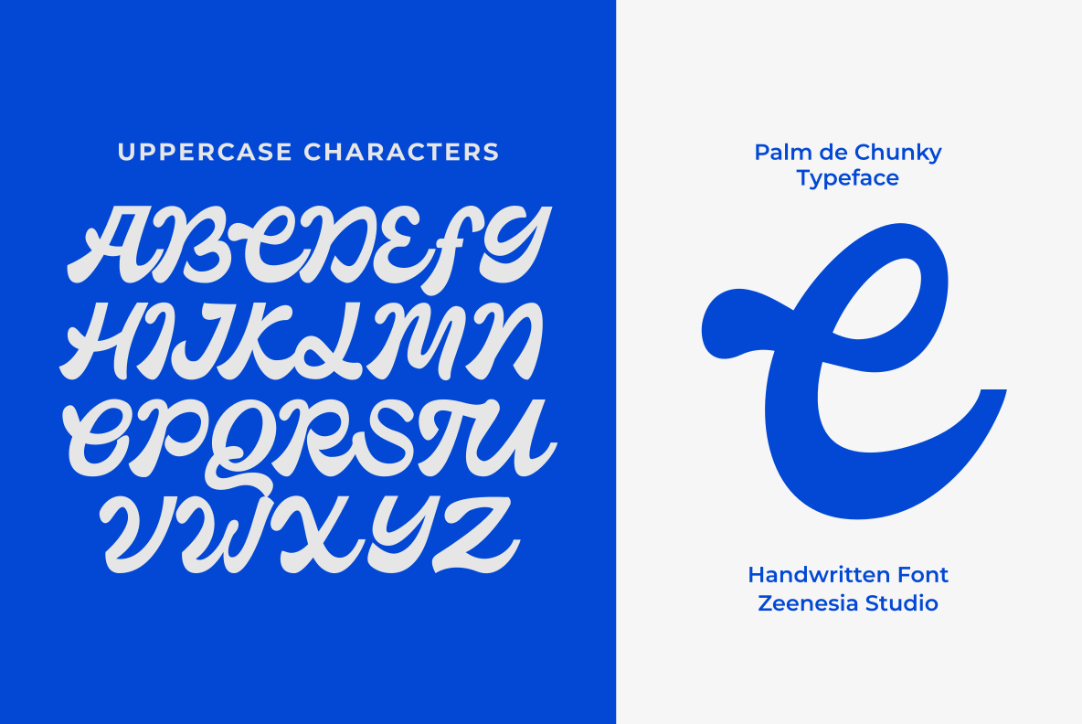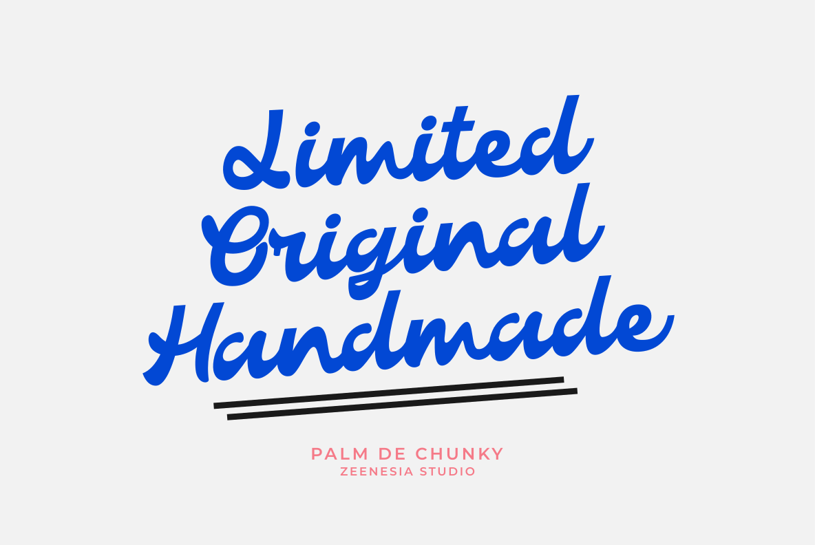 Palm de Chunky created by zeenesia is a hand-drawn script font that captures the authentic charm of handwritten lettering. Each stroke is crafted to feel natural vibe to your designs. With its chunky strokes and smooth curves. Ideal for logos, posters, packaging, social media, and creative branding, Palm de Chunky delivers a friendly charm that stands out while staying stylish. Every curve is crafted with love, making it a versatile choice for projects that need both personality and authenticity.