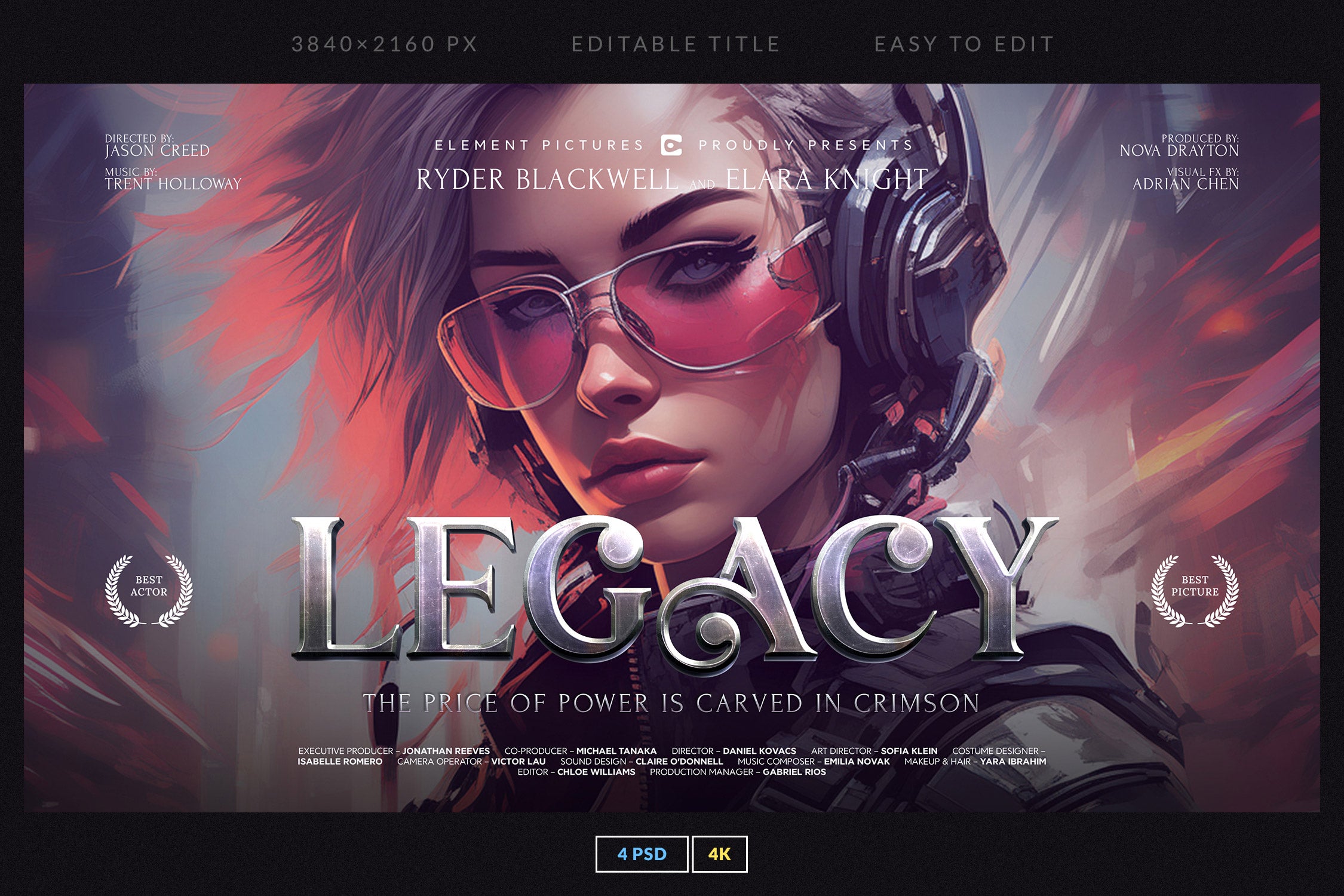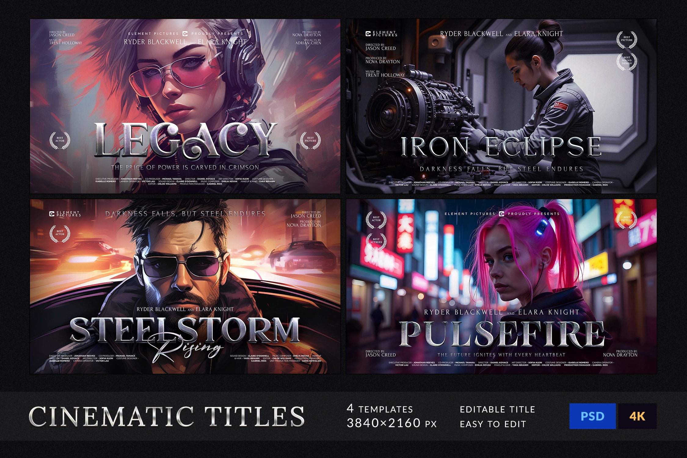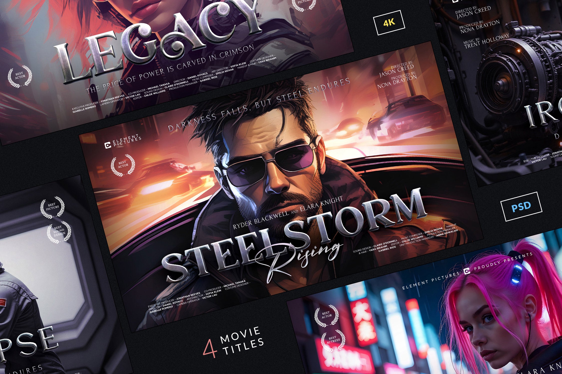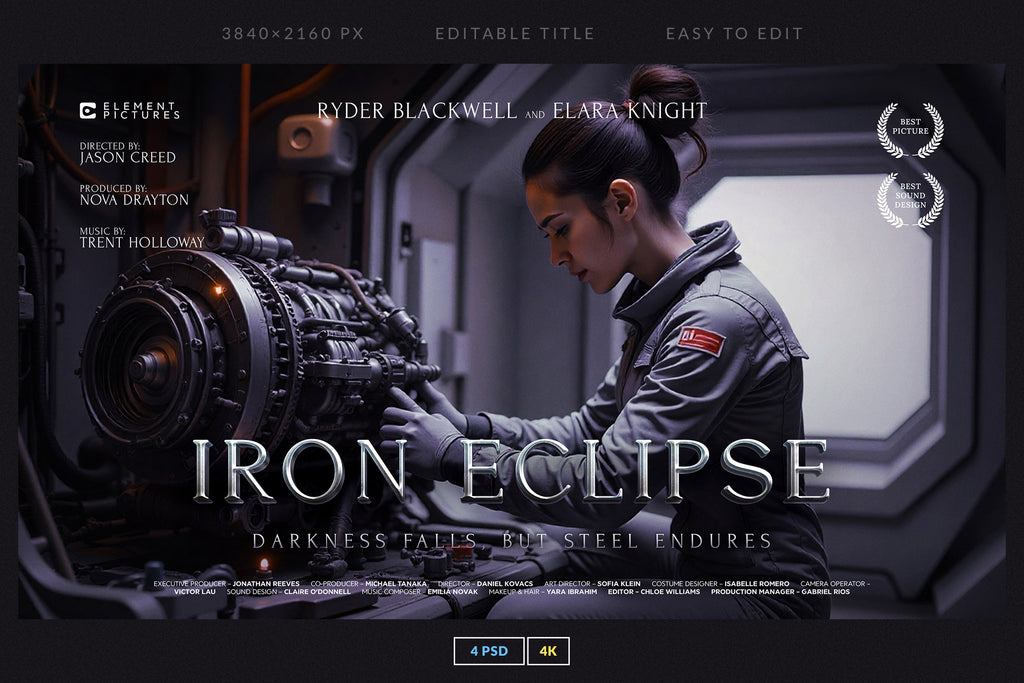 The set includes 4 fully editable PSD templates in 4K resolution (3840x2160 px), featuring bold metallic and glossy lettering with dynamic compositions. Each template is easy to customize with Smart Objects and organized layers, making it simple to replace titles, adjust colors, and create your own epic movie-inspired visuals.