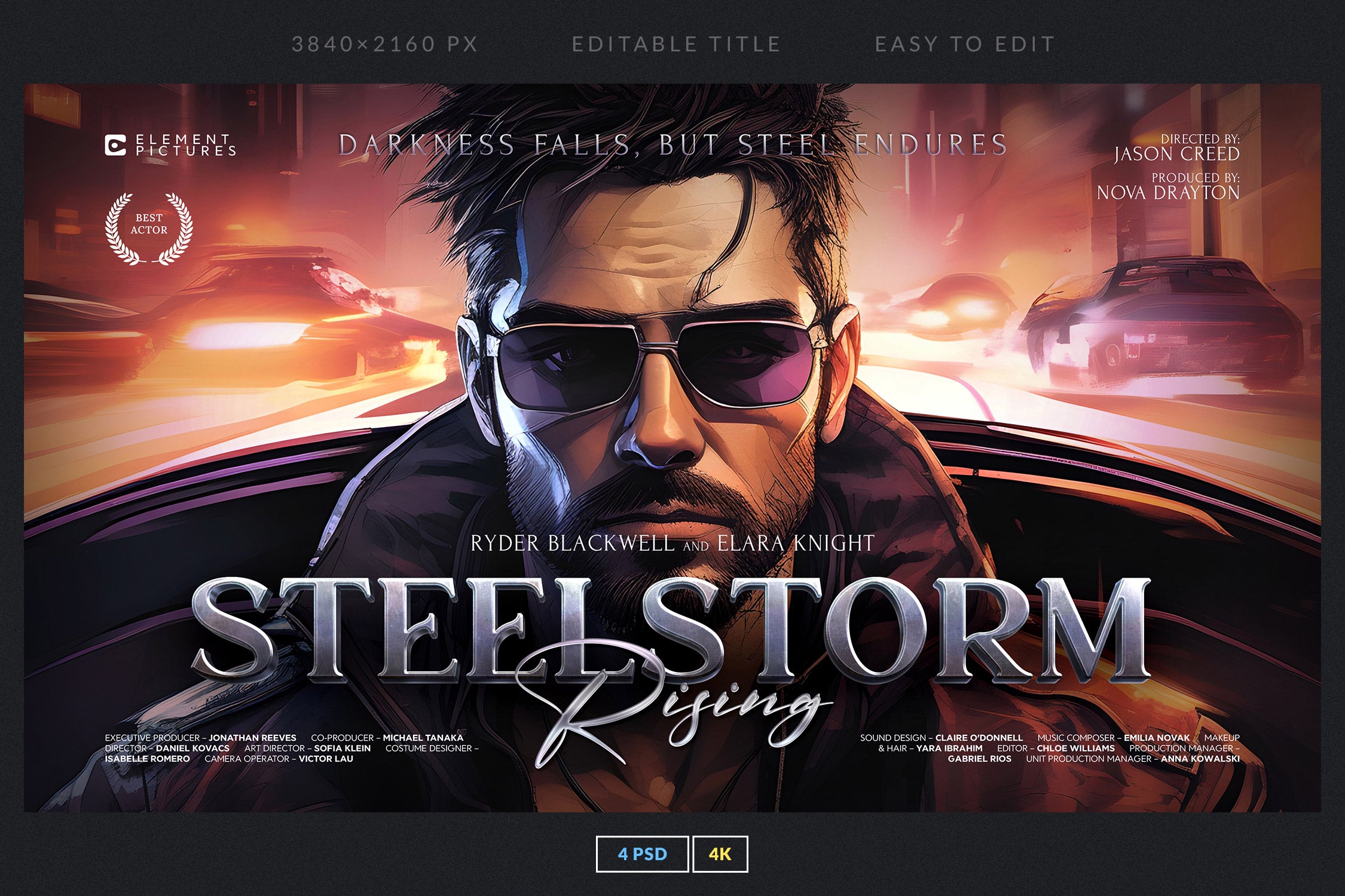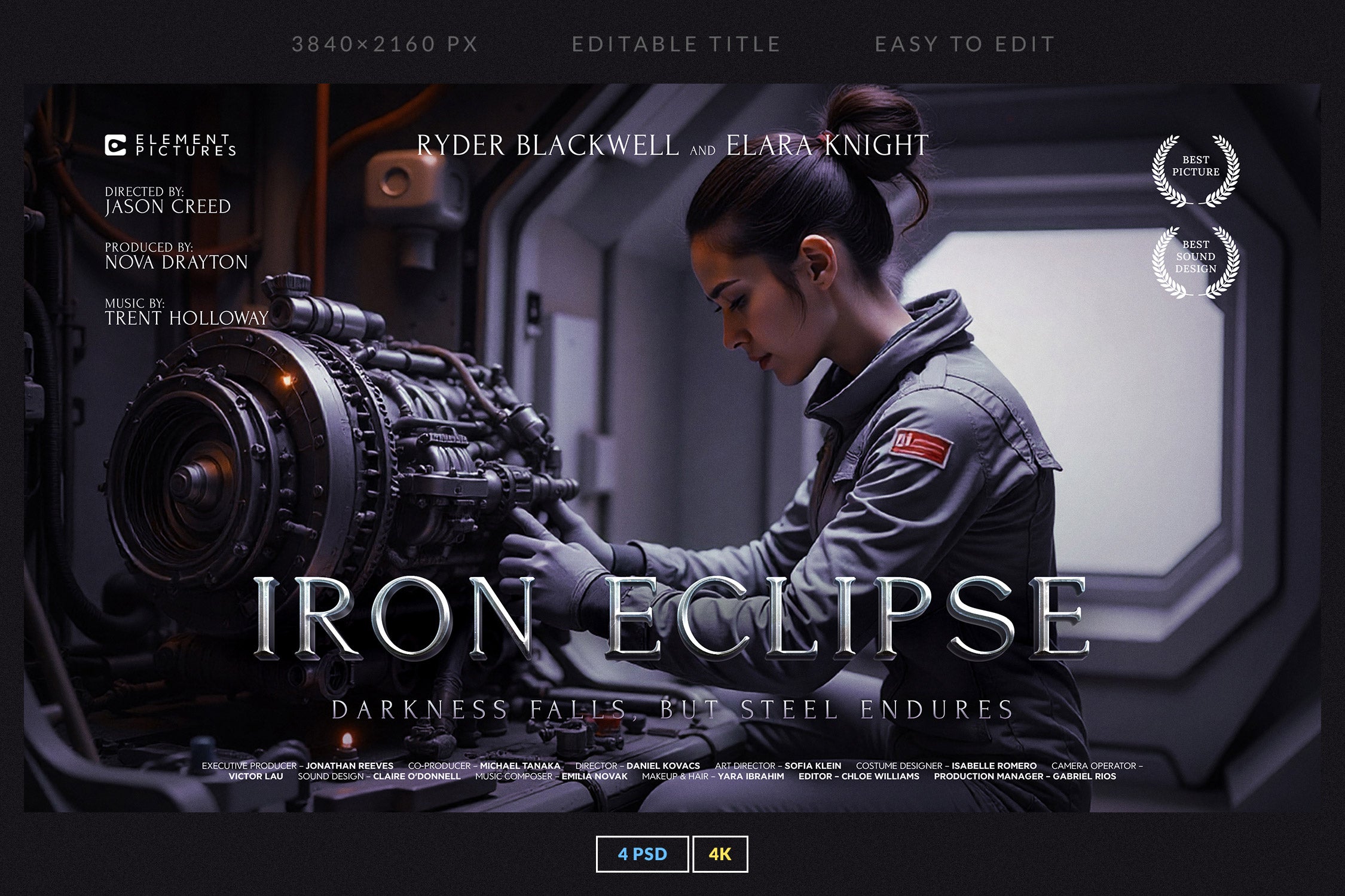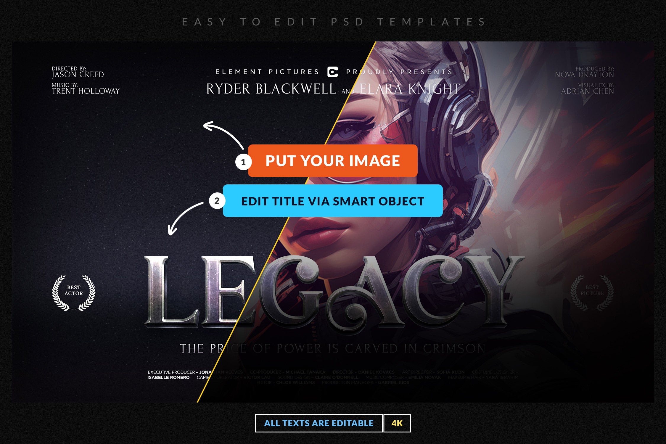 The set includes 4 fully editable PSD templates in 4K resolution (3840x2160 px), featuring bold metallic and glossy lettering with dynamic compositions. Each template is easy to customize with Smart Objects and organized layers, making it simple to replace titles, adjust colors, and create your own epic movie-inspired visuals.