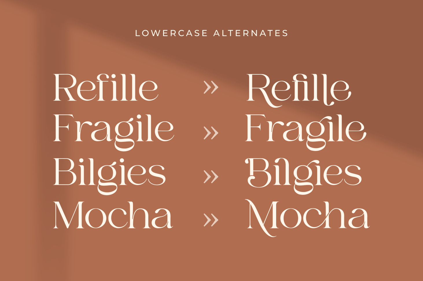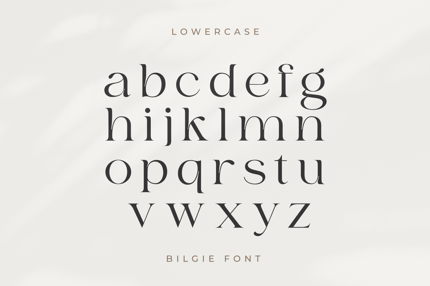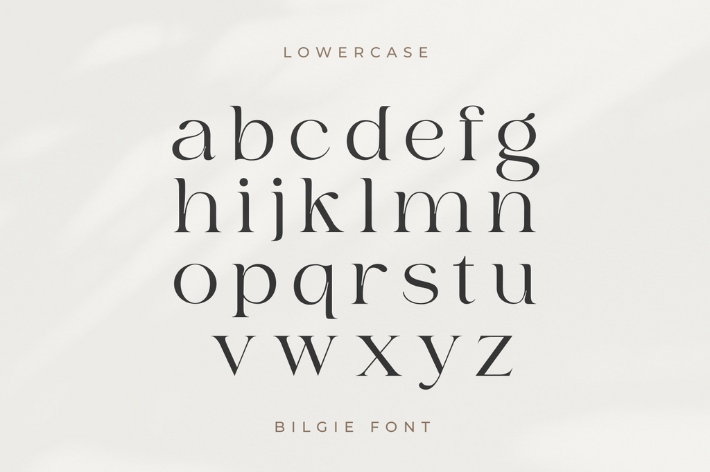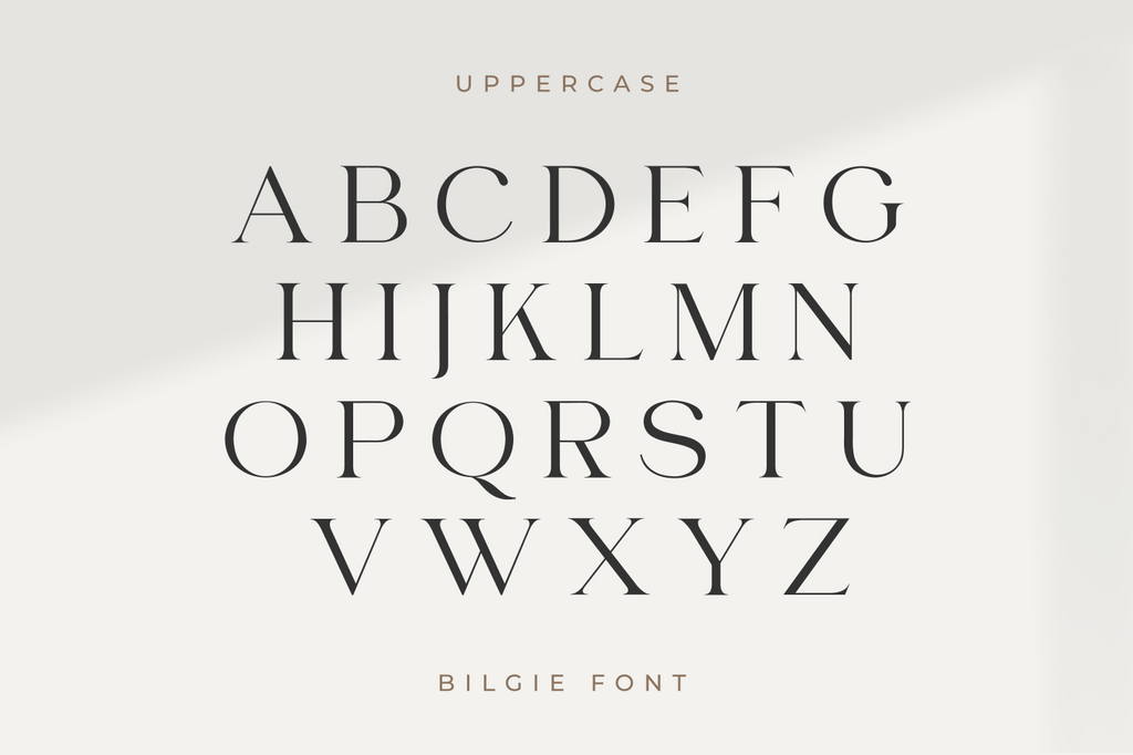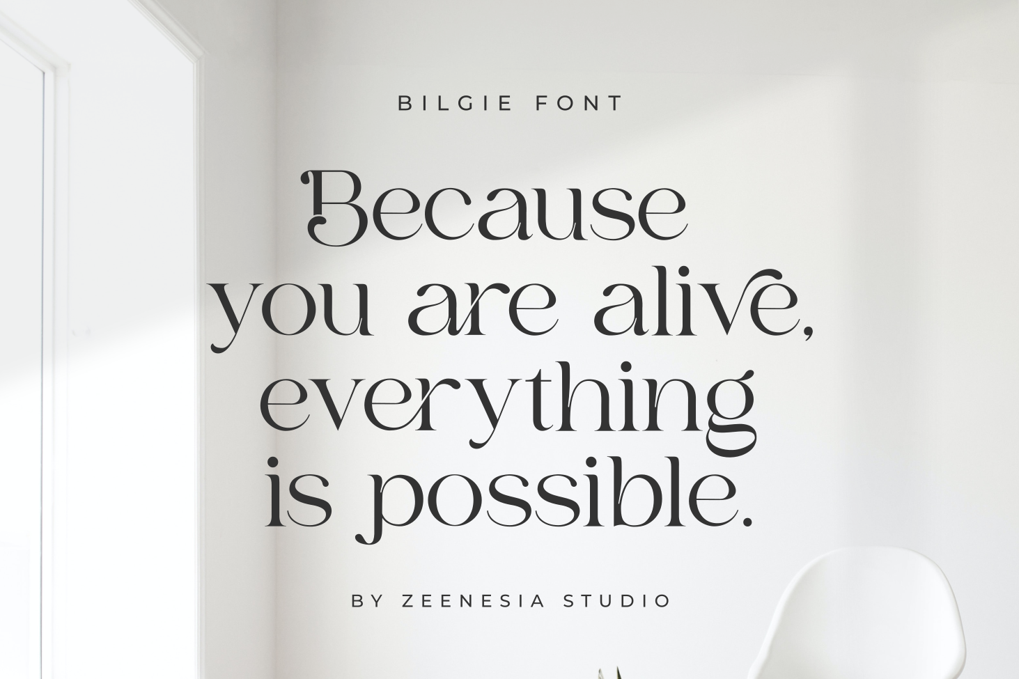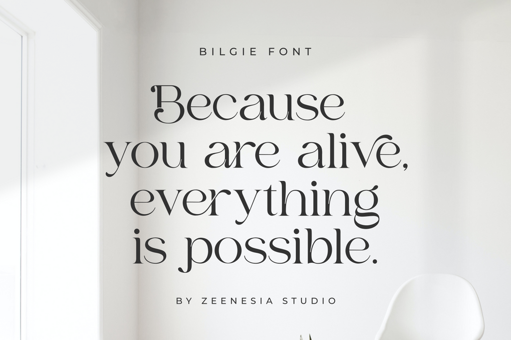 Bilgie by zeenesia is a chique font with serif style. It's modern and classic font with a unique and deference look , very versatile font that works great in large. Perfect if you need a dose of fun in your project. Perfect for editorial projects, Logo design, web font, clothing branding, product packaging, magazine headers, or simply as a stylish text overlay to any background image.