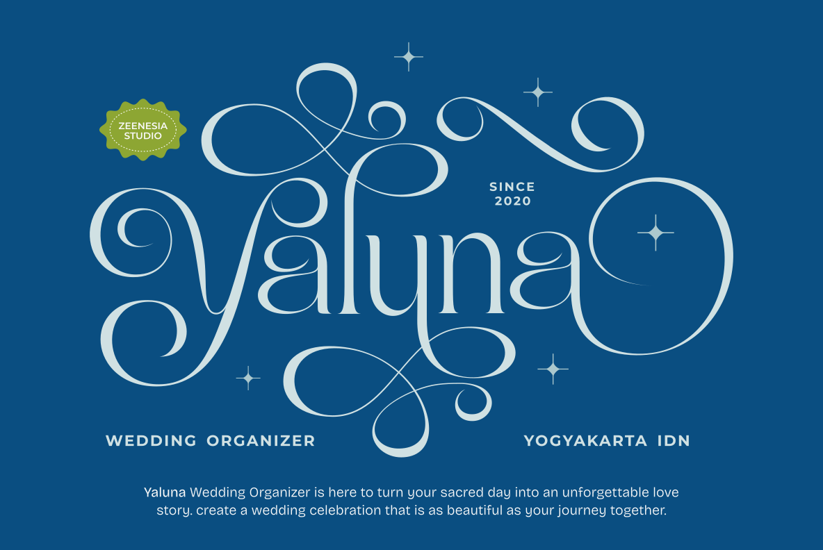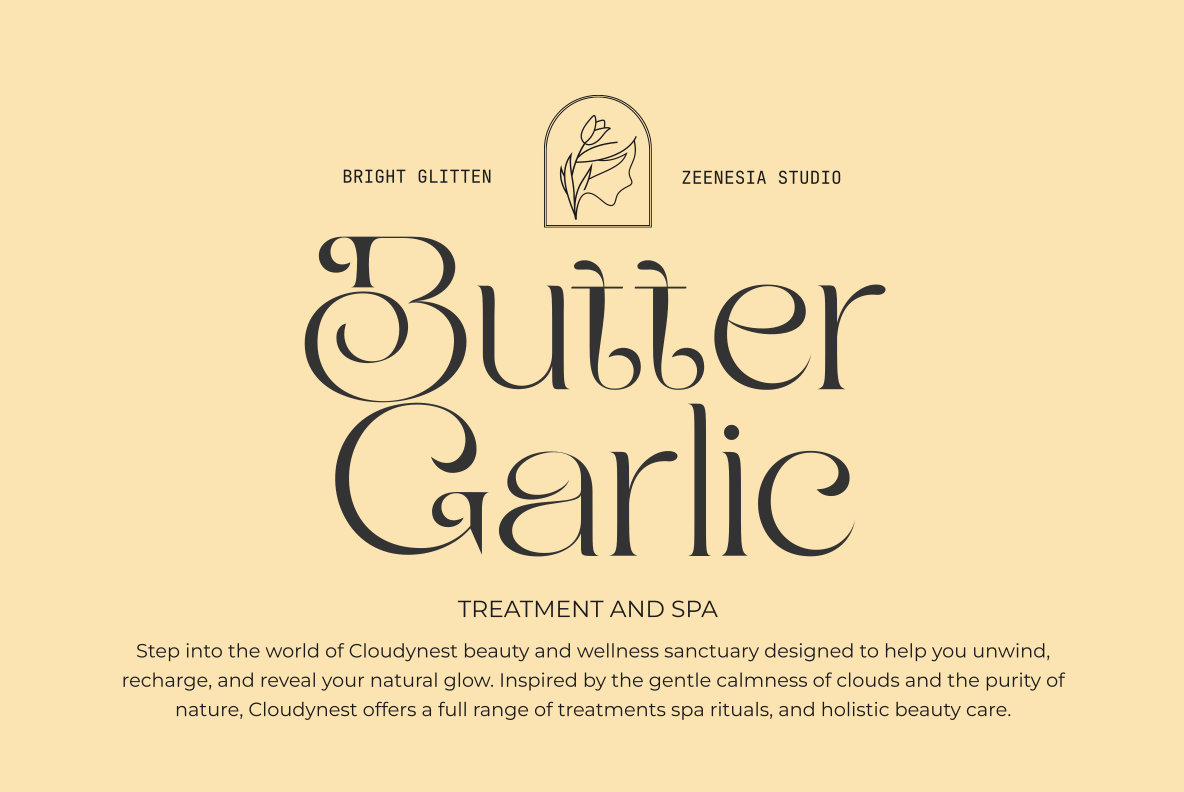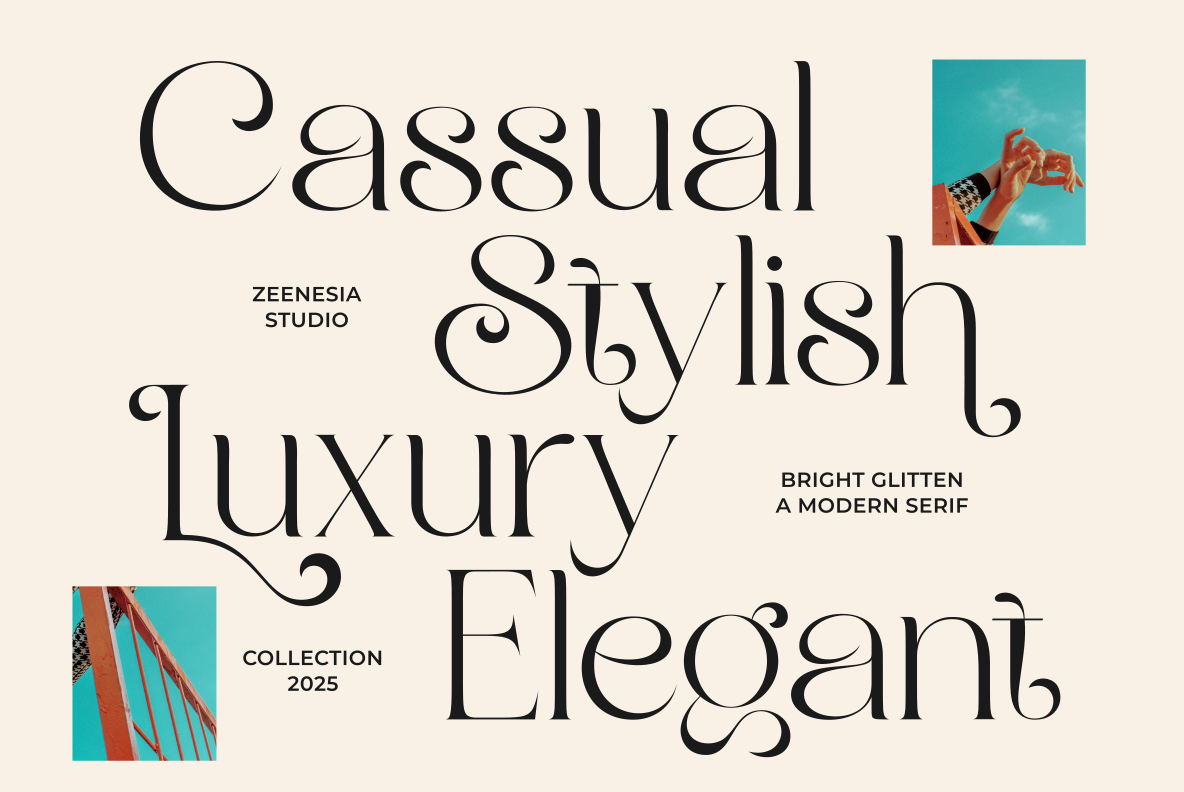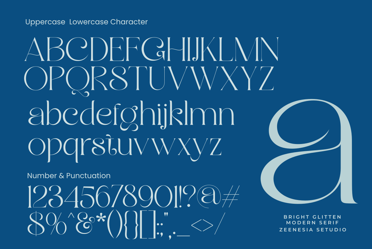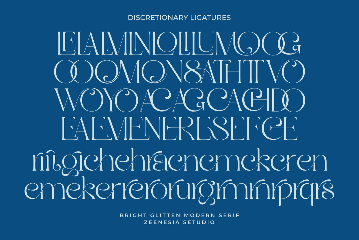 Bright Glitten created by zeenesia is a modern serif display typeface that shines with elegance and creativity. Designed with stylish curves, graceful swashes, and unique ligature alternates, this font captures attention instantly. Its refined details and glamorous personality make it perfect for high-end branding, editorial design, wedding invitations, packaging, and any project that needs a touch of luxury and sparkle.