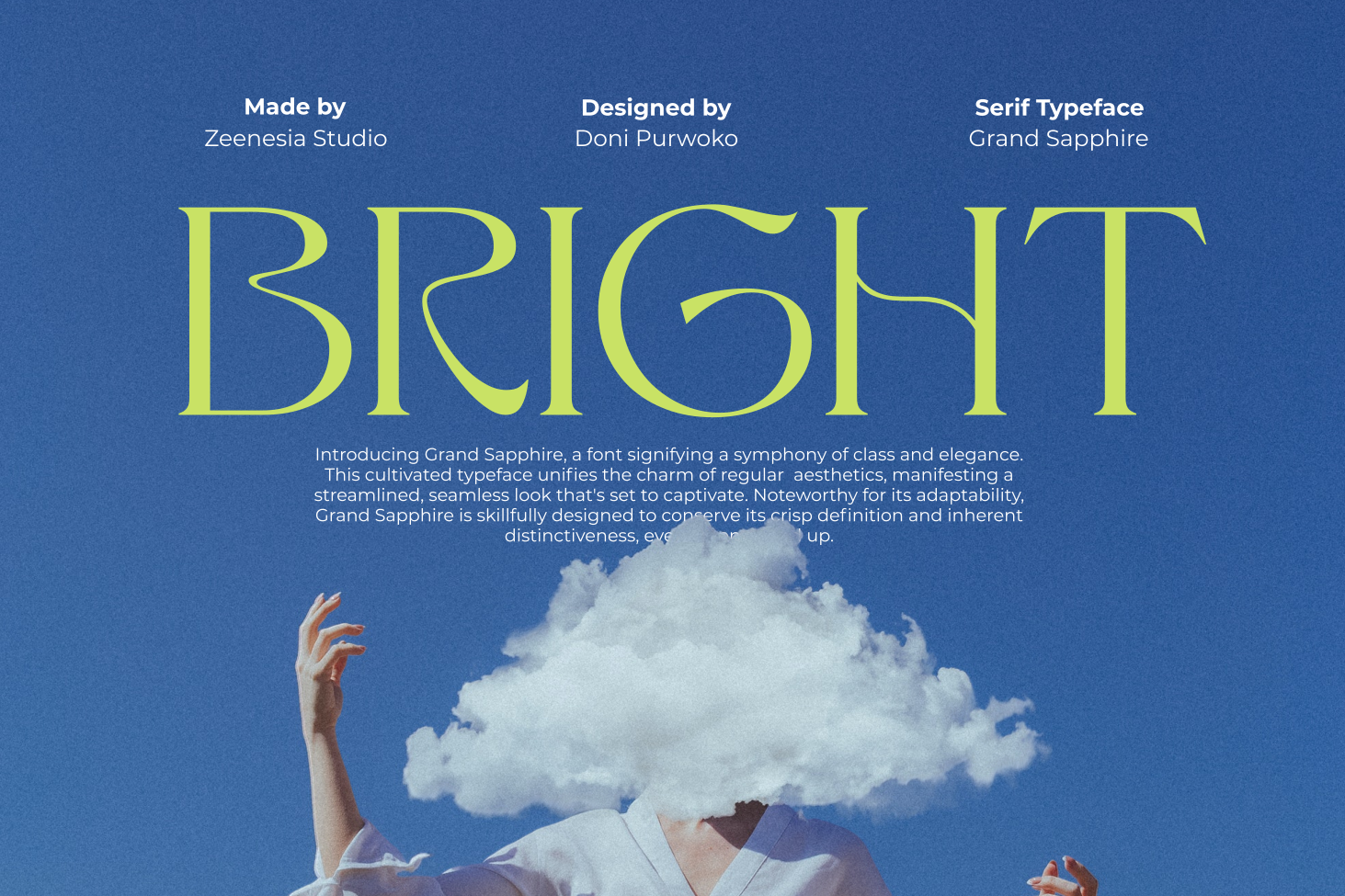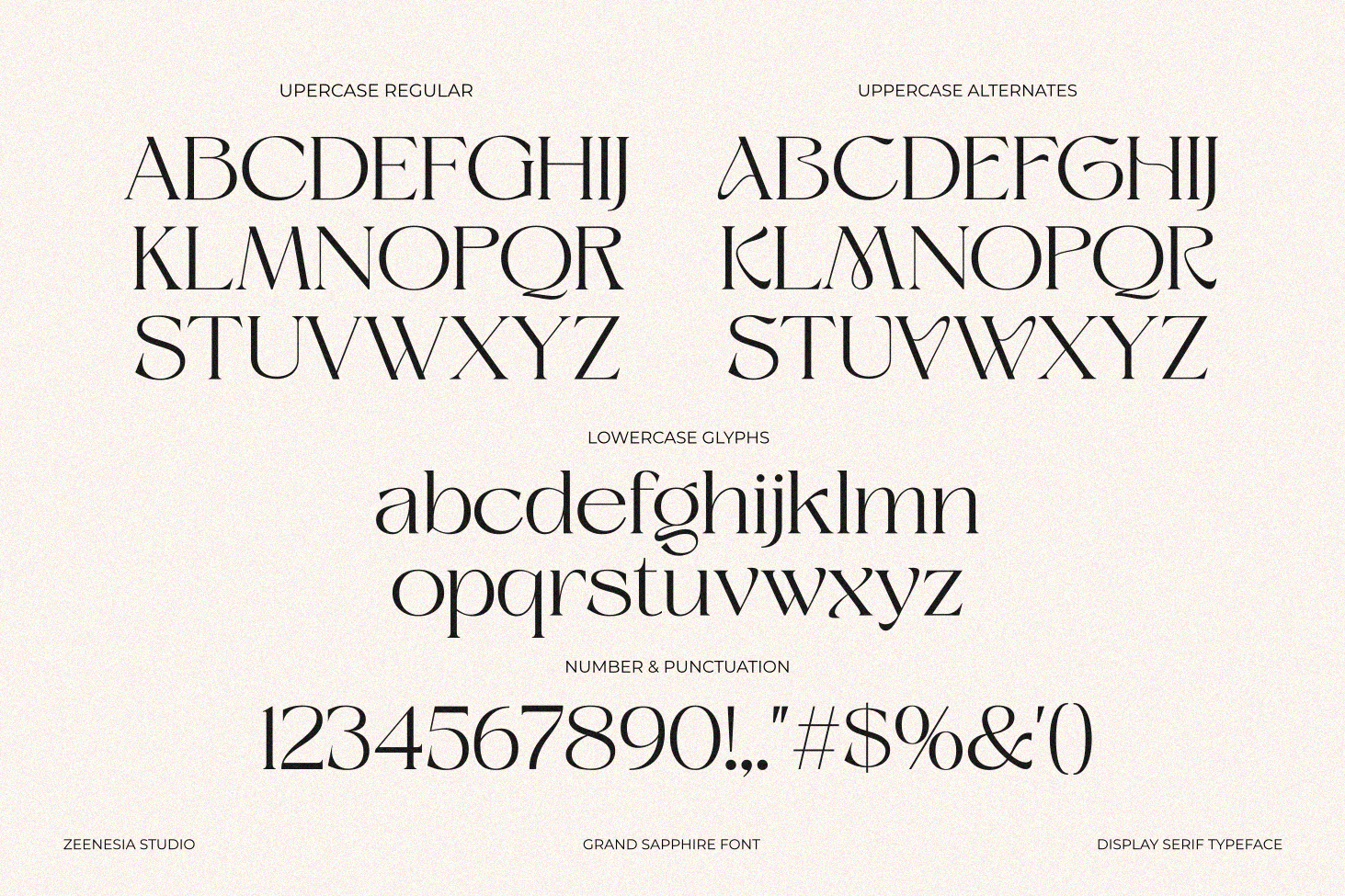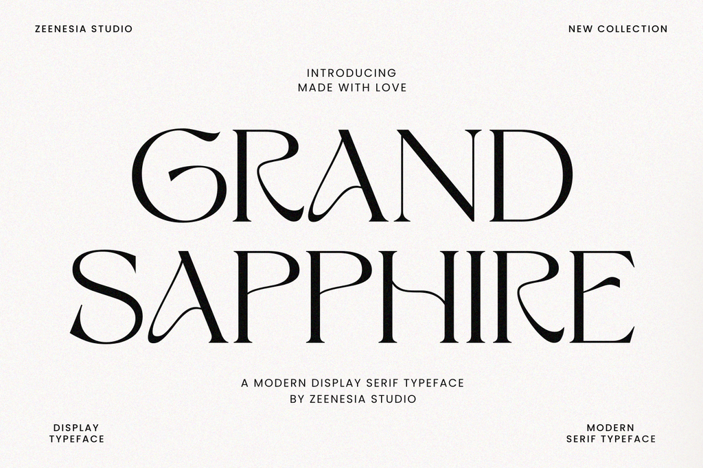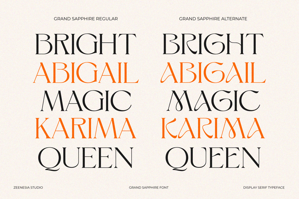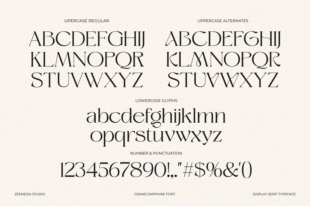 Grand Sapphire created by zeenesia is a beautiful and feminine serif font designed with a romantic and lovely aesthetic. Grand Sapphire offers two complementary styles: regular and alternate. This versatility enhances creative possibilities, allowing for extraordinary imagination and design flexibility. Despite its ornate design, Grand Sapphire maintains high readability, making it suitable for both headlines and body text. Grand Sapphire is more than just a font; it's a tool to bring your most beautiful and imaginative designs to life. Whether you're creating elegant wedding invitations, heartfelt letters, or sophisticated branding materials, Grand Sapphire provides the perfect blend of romance and elegance.