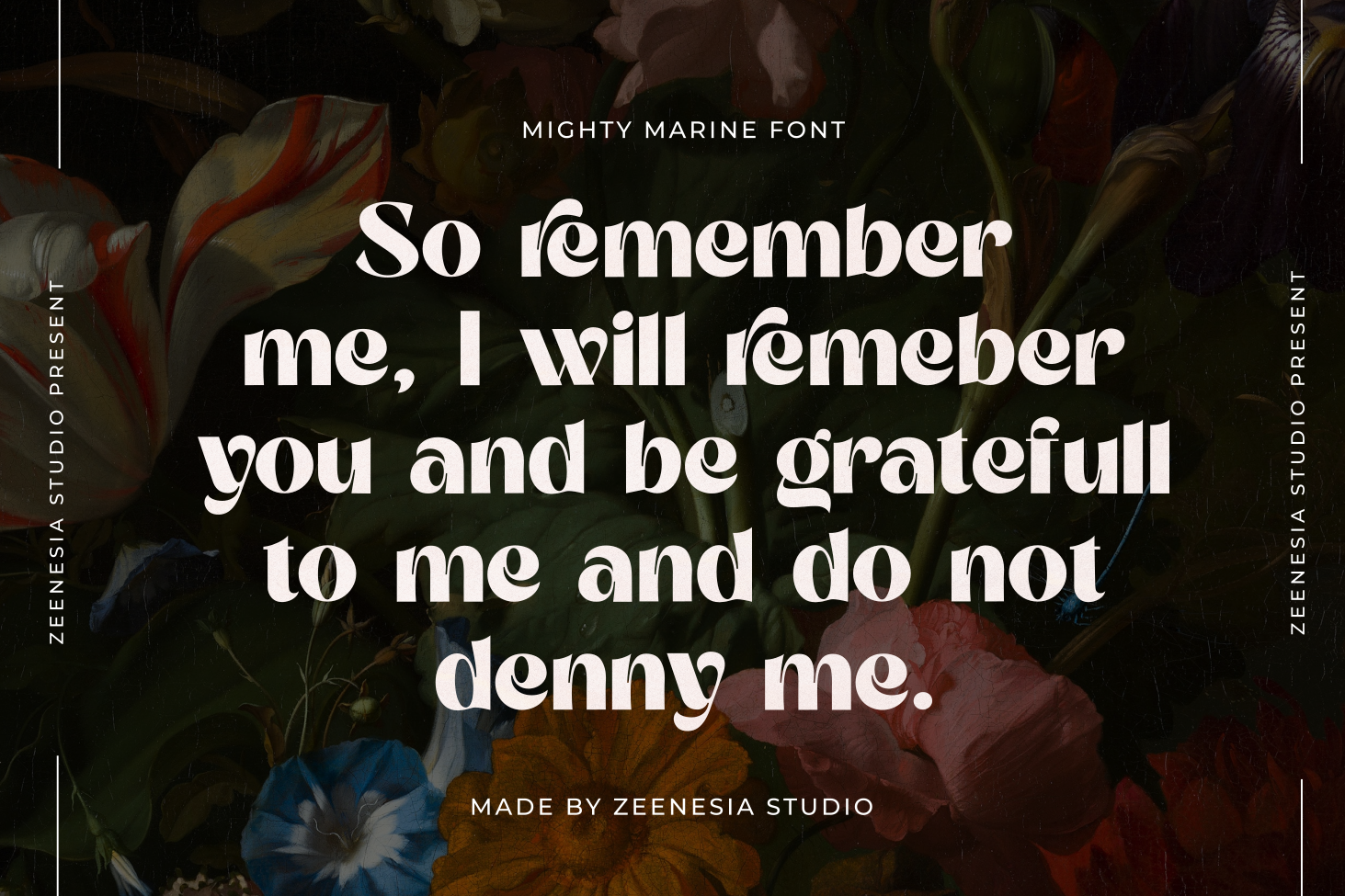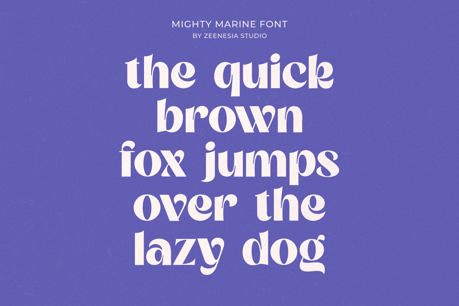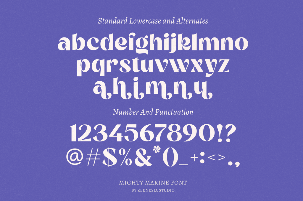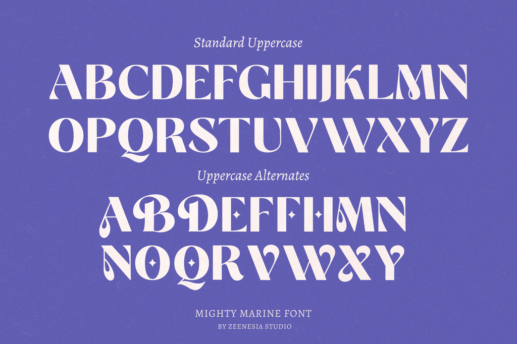Mighty Marine by zeenesia is a Bold vintage style serif font with strong character and soft features. modern and classic serif font with a clear and bold look. It’s a very versatile font that works great in large. Mighty Marine was built with Open Type features, stylistic Alternate and Ligature makes your project will be awesome! Perfect for editorial projects, Logo design, web font, clothing branding, product packaging, magazine headers, or simply as a stylish text overlay to any background image.