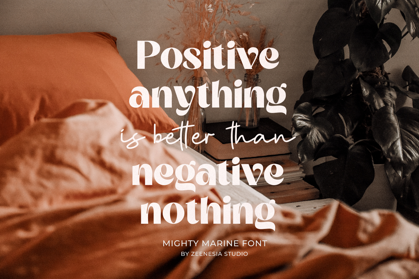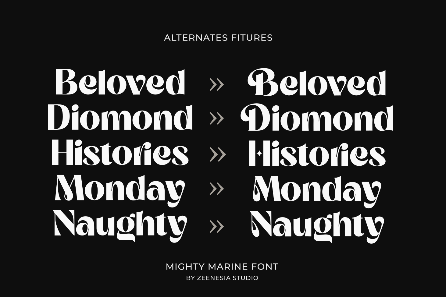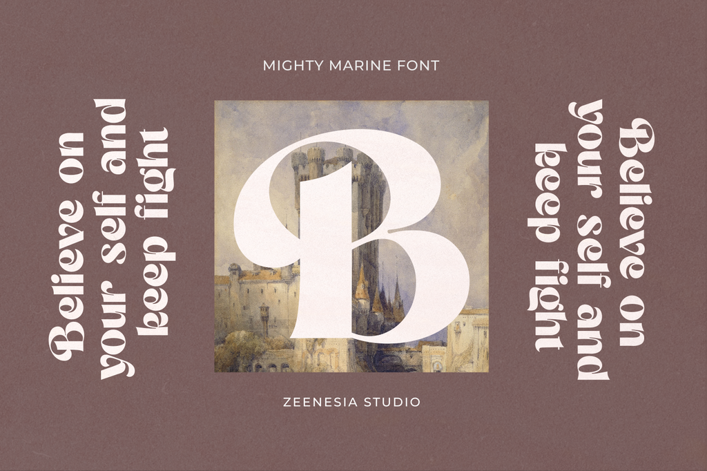 Mighty Marine by zeenesia is a Bold vintage style serif font with strong character and soft features. modern and classic serif font with a clear and bold look. It’s a very versatile font that works great in large. Mighty Marine was built with Open Type features, stylistic Alternate and Ligature makes your project will be awesome! Perfect for editorial projects, Logo design, web font, clothing branding, product packaging, magazine headers, or simply as a stylish text overlay to any background image.