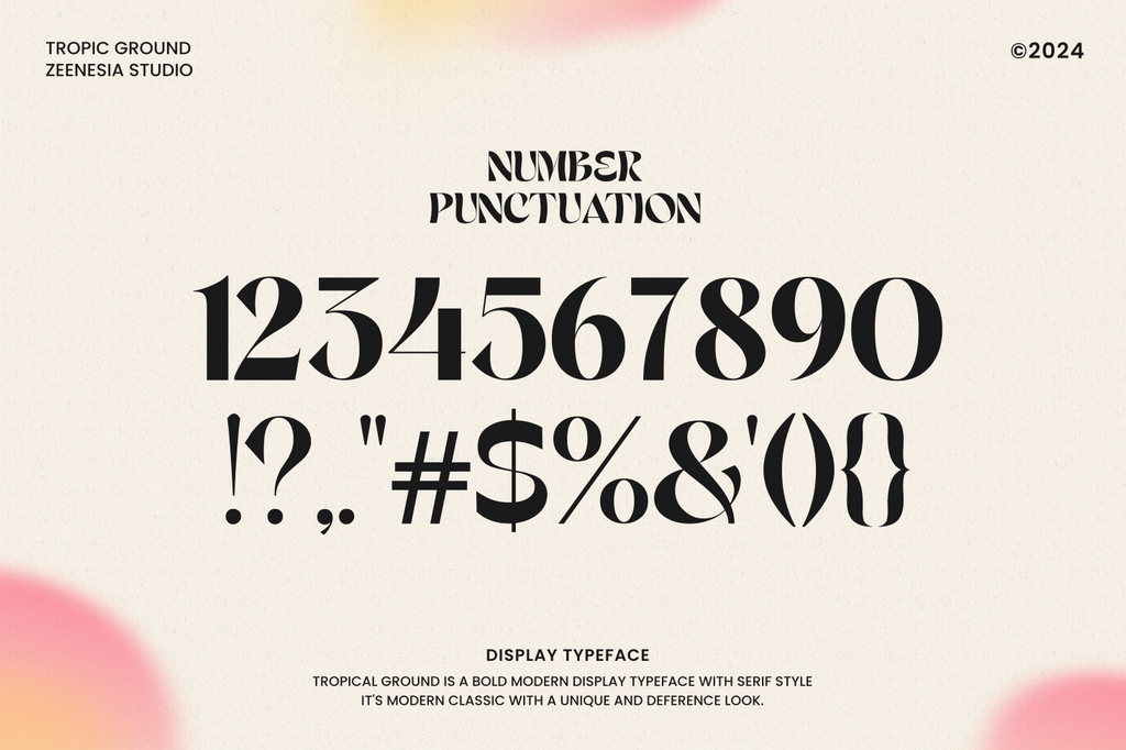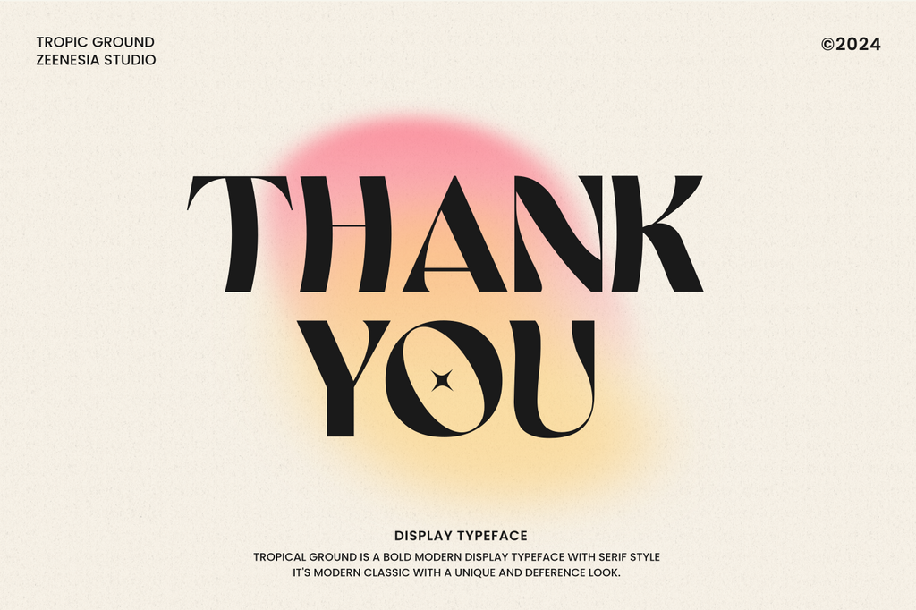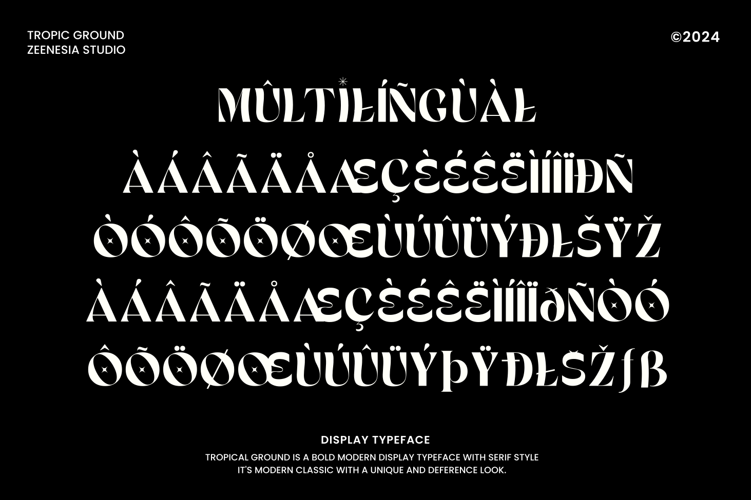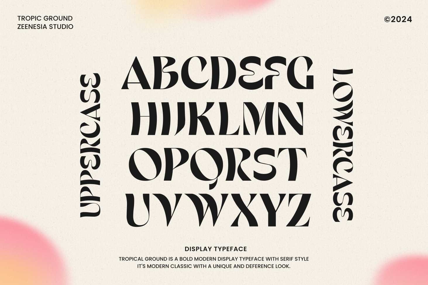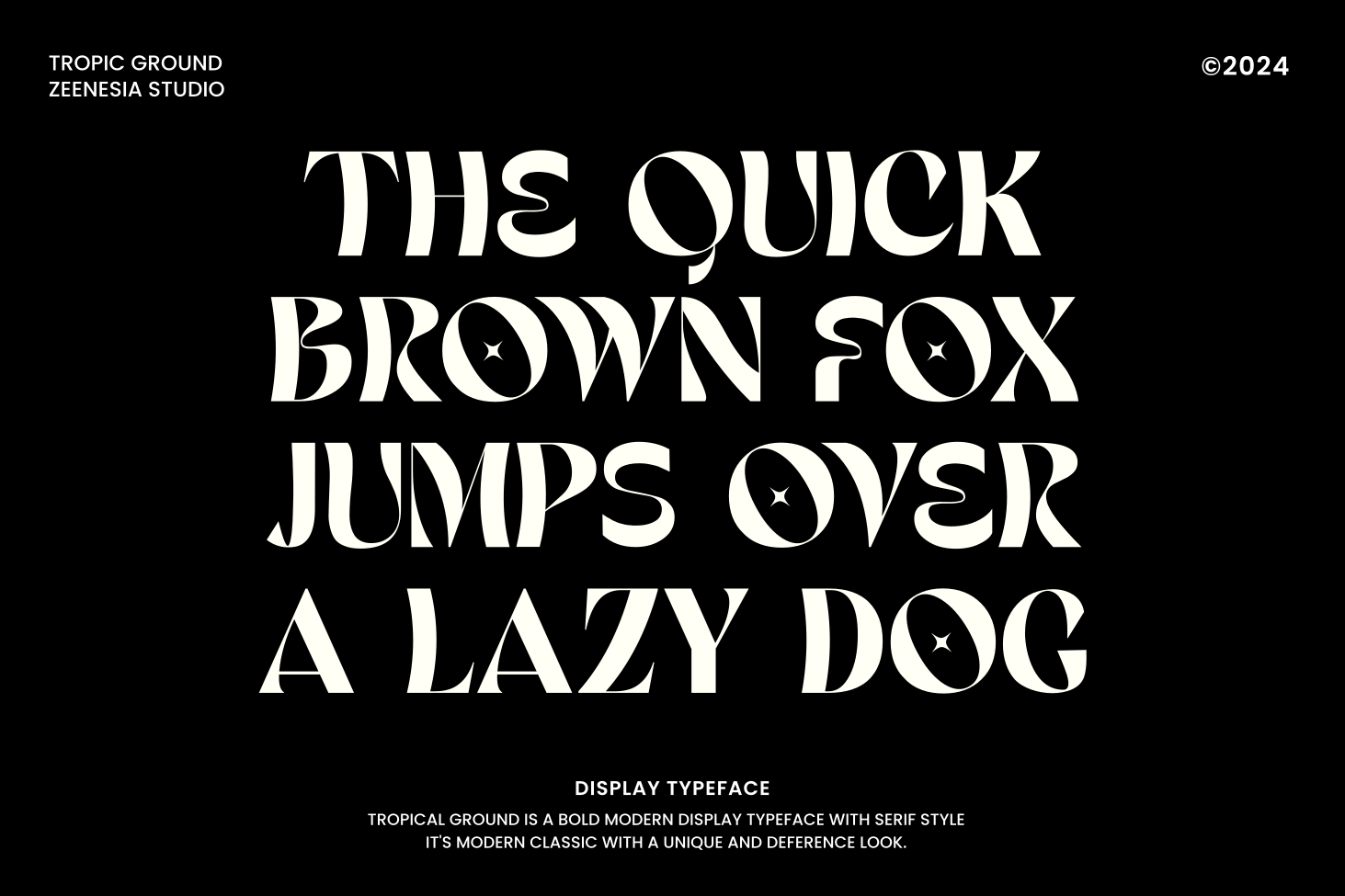 Tropic Ground created by zeenesia is a unique display font with serif style. It's modern and classic font with a unique and deference look . Perfect if you need a dose of fun in your project. Perfect for editorial projects, Logo design, web font, clothing branding, product packaging, magazine headers, or simply as a stylish text overlay to any background image.
