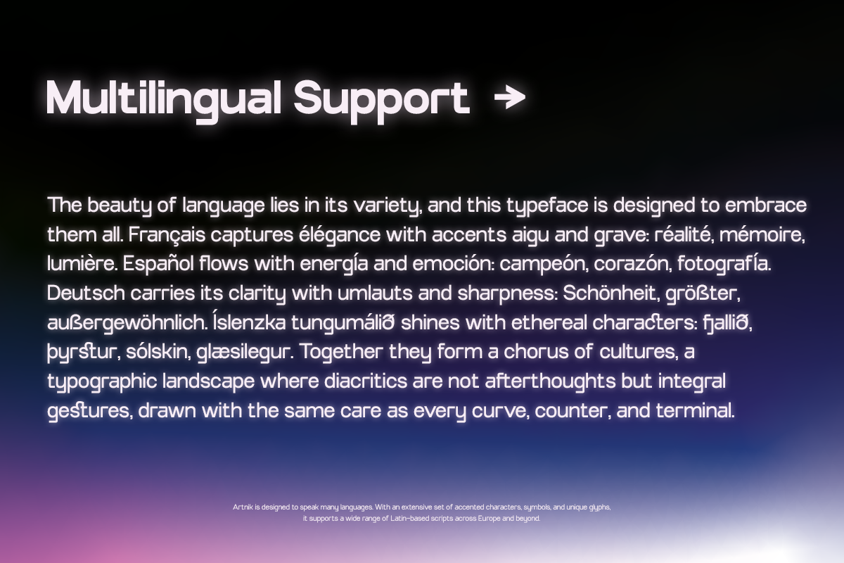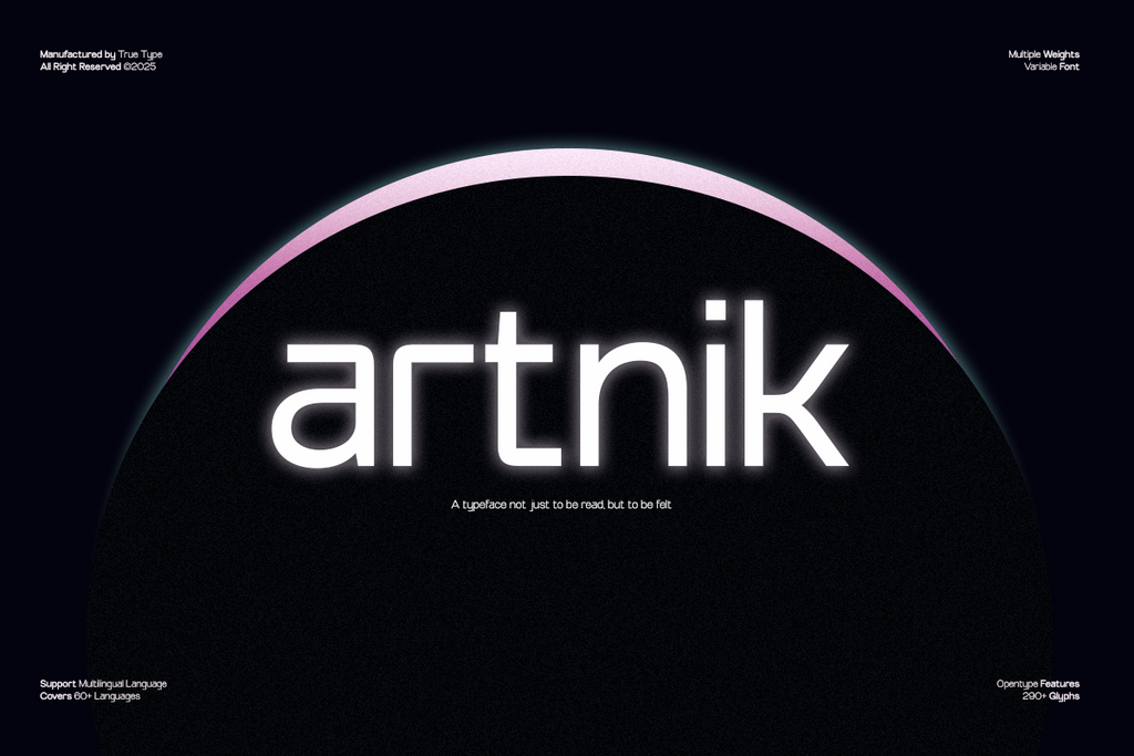 The result is TRT Artnik — a semi-display sans serif that maintains a geometric structure yet remains versatile for a wide range of projects. From branding and editorial work to digital interfaces, Artnik is designed to be clear, clean, and full of character.