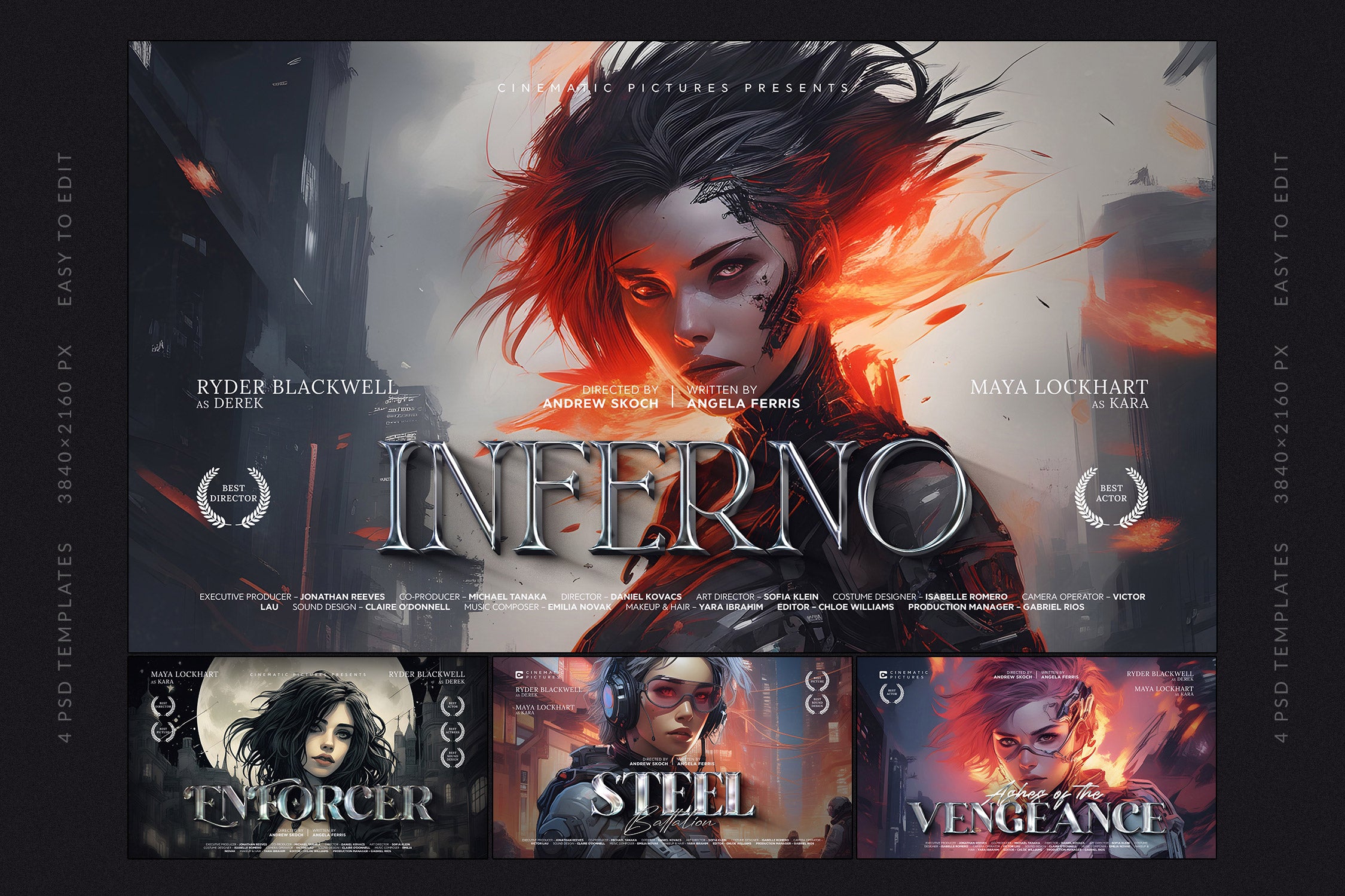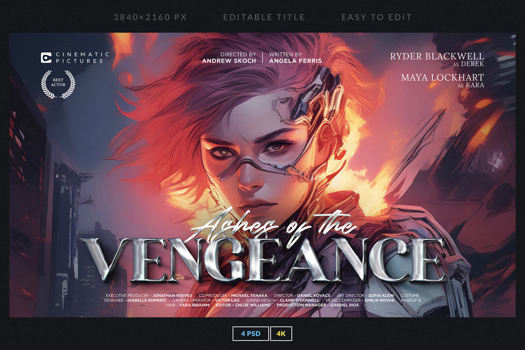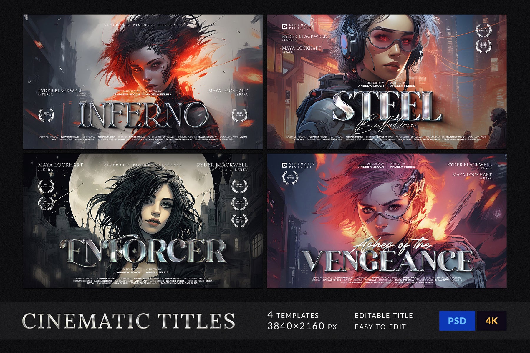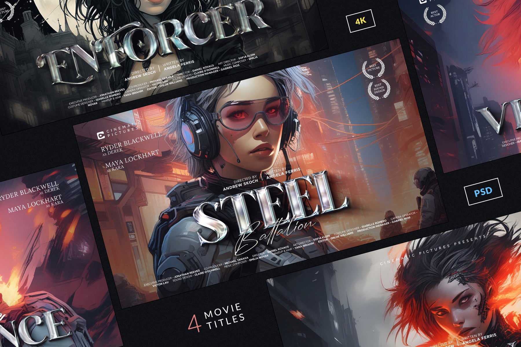 The set includes 4 fully editable PSD templates in 4K resolution (3840x2160 px), featuring bold metallic and glossy lettering with dynamic compositions. Each template is easy to customize with Smart Objects and organized layers, making it simple to replace titles, adjust colors, and create your own epic movie-inspired visuals.