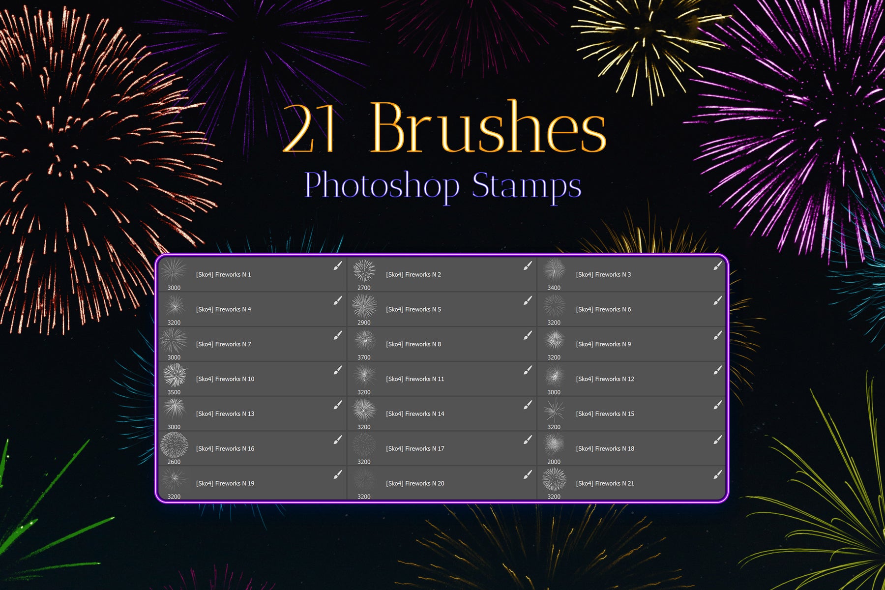 Bring instant celebration to your designs with Fireworks Stamps Photoshop Brushes by Andrew Skoch — a vibrant collection of 21 high-quality Photoshop brushes inspired by real fireworks bursts, spark trails, glitter explosions, and festival lights.