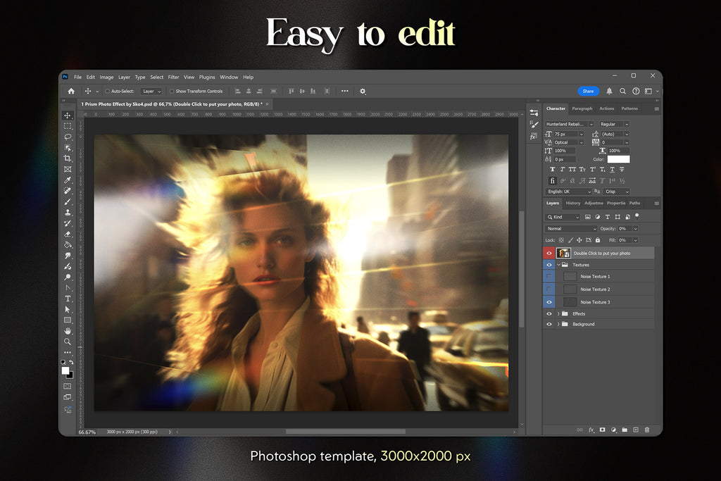 Perfect for portraits, fashion photography, and creative projects, these effects bring a stylish, cinematic feel to your images. Fully editable via Smart Objects, the templates make it quick and easy to customize your photos into captivating, prismatic masterpieces.