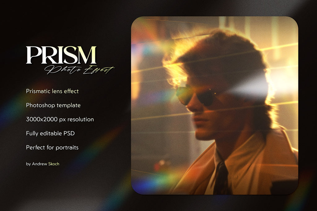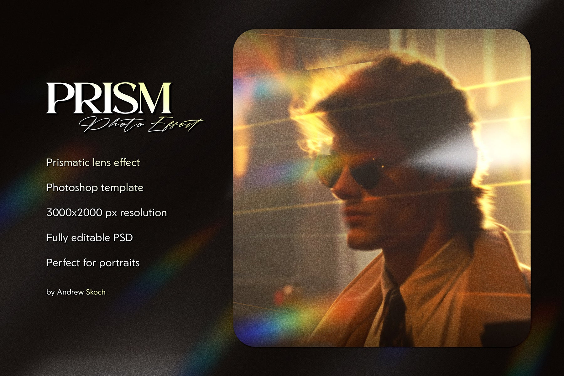 Add a touch of modern artistry to your portraits with the Prism Photo Effect created by Andrew Skoch. This PSD template offers a unique prismatic lens effect that creates stunning light refractions, dreamy blurs, and colorful rainbow streaks.