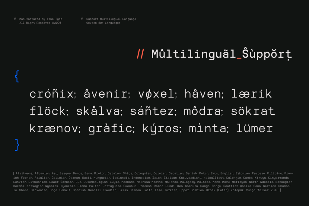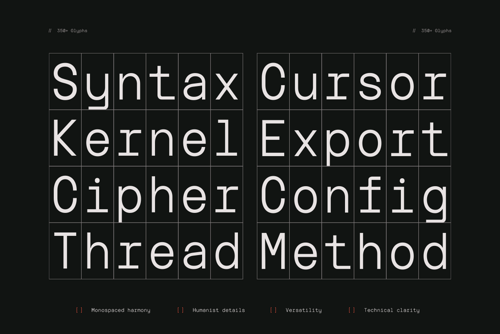 The result is TRT Interval — a modern monospace sans serif designed for clarity, rhythm, and versatility. Whether used in branding, editorial layouts, user interfaces, or code, Interval delivers a strong typographic voice that’s both functional and refined.